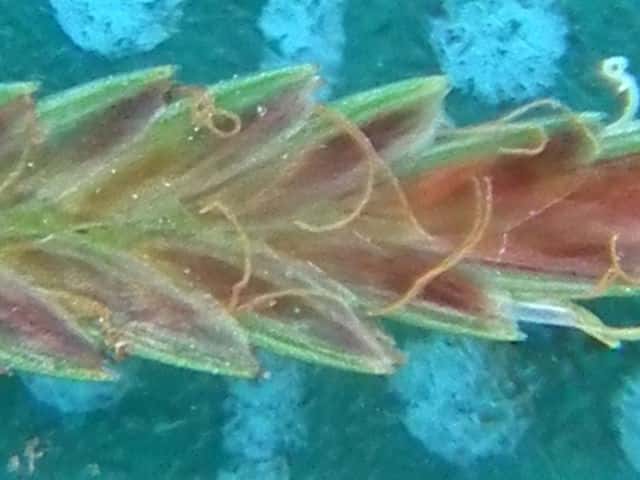 | ▼鱗片の中の花、花柱と子房、葯がある。 | ▼未熟な果実、2岐した柱頭がある。 | |