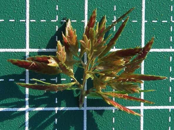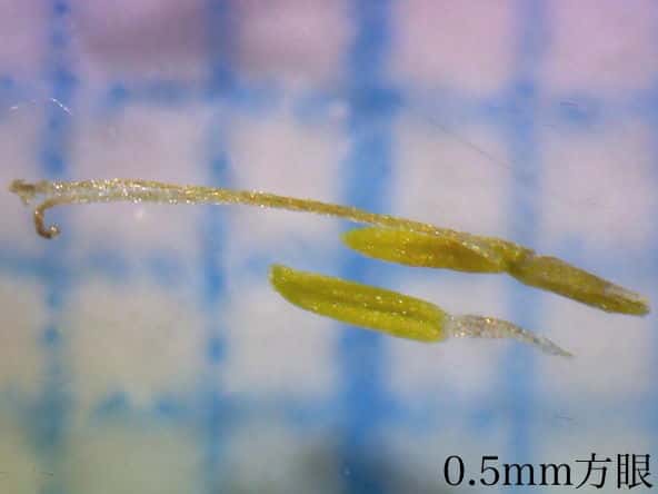 | ▼鱗片の先は鋭頭。 | ▼鱗片は長さ約2mm。 | ▼果実は長さ約1mm。柱頭は2岐。 |