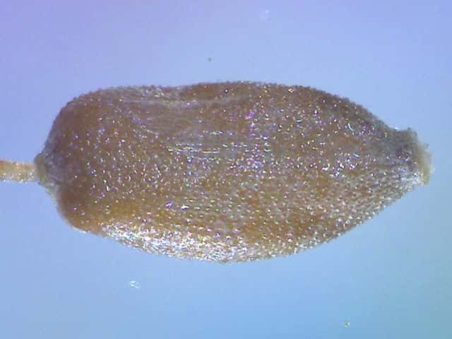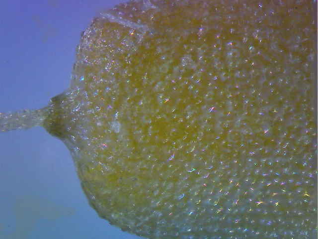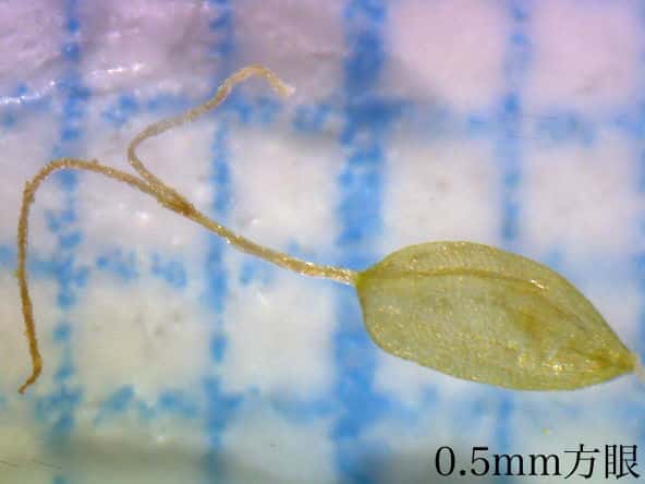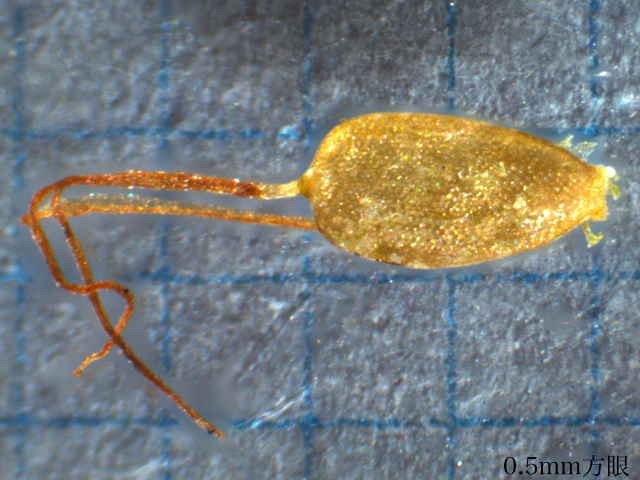 | ▼鱗片は長さ2.1〜2.2mm。 | ▼柱頭は2岐し、果実は長さ約1mm。 | ▼果実の表面には粒状突起が密生する。 |
