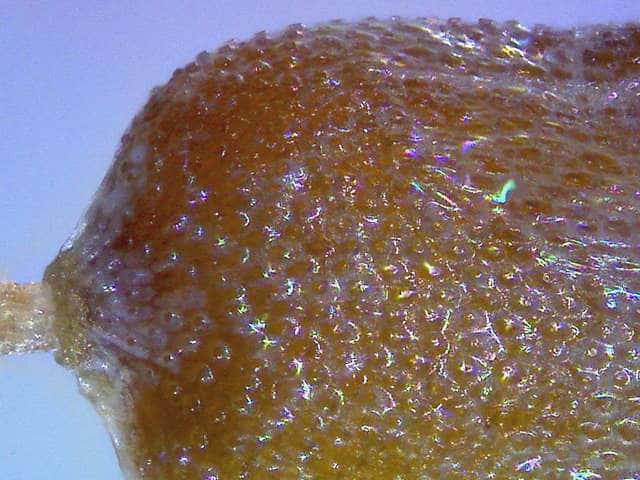 | ▼果実は長倒卵形。 | ▼果実の表面に微細な粒状突起がある。 | |