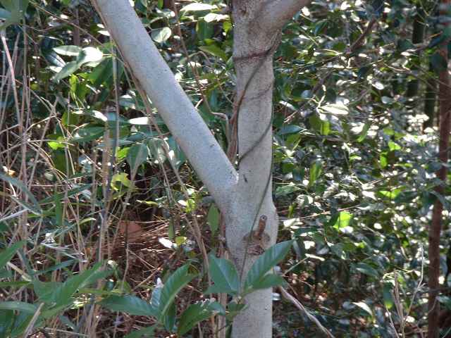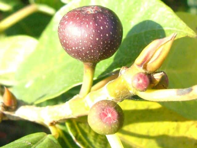 | 落葉低木 関東地方〜九州の山地や丘陵に生え、高さ約5mになる。樹皮は灰褐色で、本年枝は無毛。葉は互生し、長さ8〜20cm、幅3〜8cmの卵状楕円形。先は急にとがり、基部は円形またはハート形、全縁。両面とも無毛。葉柄は長さ2〜5cm、ほとんど無毛。托葉は長さ8〜12cmの狭披針形。本年枝の葉腋に長さ8〜10mmの花のうが1個ずつつく。雌雄異株。雄と雌の花嚢は同形だが、雄花嚢は基部が細長く伸びることが多い。秋に雌花嚢は直径1.5〜2cmの果嚢となり、黒紫色に熟し、上部に割れ目が入る。雄果嚢は熟すと上部に小さな穴が開き、羽化したイヌビワコバチが外に出る。花期は4〜5月。 品種として葉の細いホソバイヌビワがある。 冬芽は、2〜4枚の芽鱗に被われ、円錐形で、先が細くなり尖る。2個の托葉が基部で合着し芽鱗状となり冬芽を包む。この托葉が落ちた痕が托葉痕で枝を1周する。葉痕は円形または腎臓形。 学名は、Ficus erecta var. erecta クワ科イチジク属 |