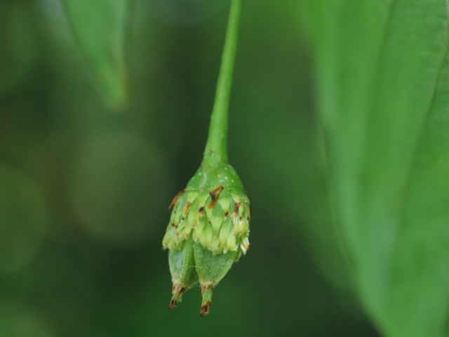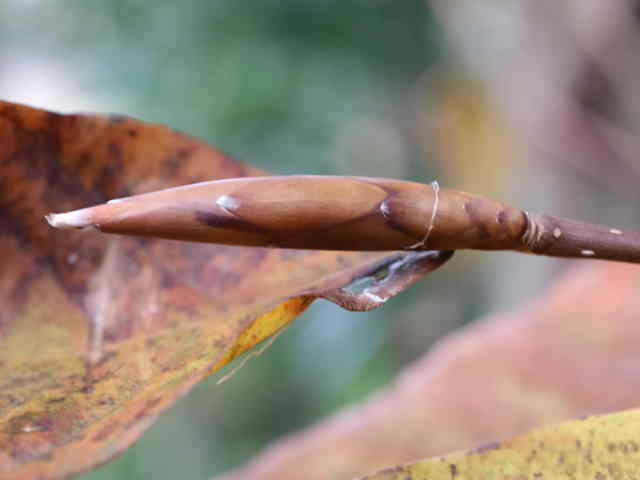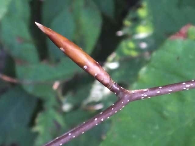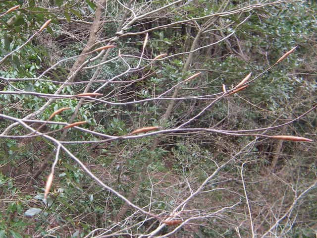 冬芽は長さ1〜2.7cmの披針形で、先は鋭くとがる。芽鱗は16〜22個。本年枝と2年枝の境にはっきりした輪状の芽鱗痕がある。(樹に咲く花)