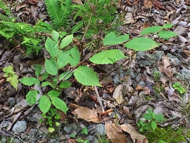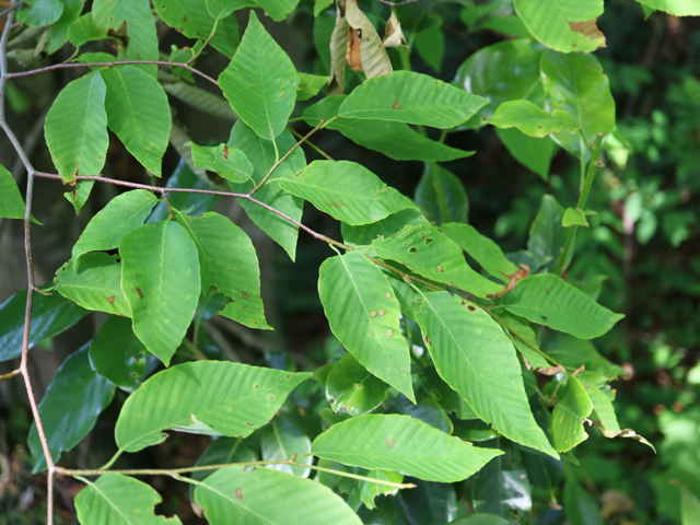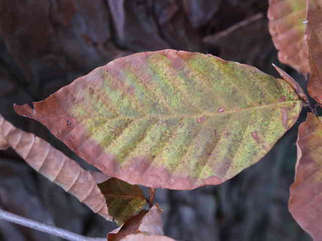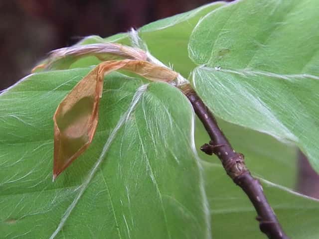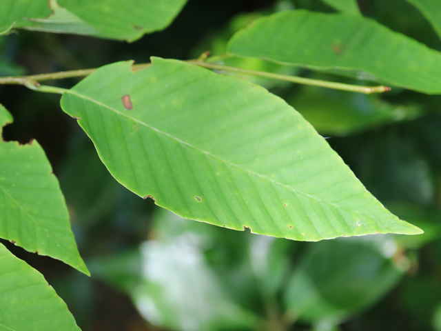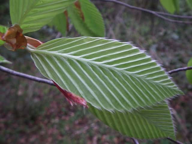 落葉高木 岩手・石川県以西の本州〜九州のブナより少し標高の低いところに生え、太平洋側のやや乾燥した山地に多い。中部地方以北の日本海側の多雪地帯にはほとんど分布しない。高さ25m、直径70cmほどになる。萌芽力が旺盛で主幹が枯れてもひこばえが成長することによって、個体としての生命を維持する。樹皮はブナの樹皮より黒っぽく、いぼ状の皮目が多い。枝は暗紫色で長楕円形の皮目が多数ある。本年枝ははじめ淡褐色の軟毛が密生する。葉は互生。葉身は長さ5〜10cm、幅3〜6cmの長楕円形で、やや薄い洋紙質。先端は鋭くとがり、基部は広いくさび形。ふちには波状の鈍い鋸歯がある。側脈は10〜14対あり、葉の裏面に突出する。若葉は両面とも長い軟毛がある。表面はやがて無毛になるが、裏面脈上の毛は黄葉のころまで残る。葉柄は長さ4〜9mm。托葉は長さ2〜2.5cmの倒披針形。褐色で軟毛があり、開葉後まもなく落ちる。雌雄同株。葉の展開と同時に開花する。雄花序は新枝の下部の葉腋から垂れ下がり、6〜15個の雄花が頭状に集まってつく。雄花序の柄は長さ2.5〜4.5cmで、長い軟毛がある。雄花の花被は長さ5mmほどの円錐形で、淡褐色の長毛が密生し、上部は6裂する。雄しべは12個あり、葯は花被の外に出る。雌花序は新枝の上部の葉腋に上向きにつく。雌花は直径5mmほどの総苞の中に2個入っている。総苞は4裂し、外側には短毛が密生する。花柱は3個。果実は堅果。10月に成熟する。堅果は長さ1〜1.2cmの3稜形で、長さ2.5〜5cmの長い柄の先に垂れ下がってつく。堅果の基部には長さ約5mmの小さな殻斗がある。殻斗の外側には卵状三角形のやわらかい刺がある。花期は4〜5月。