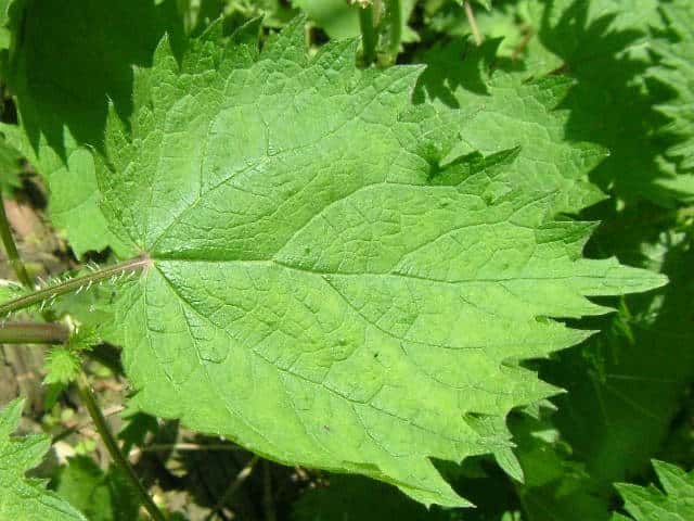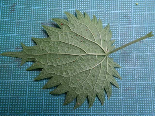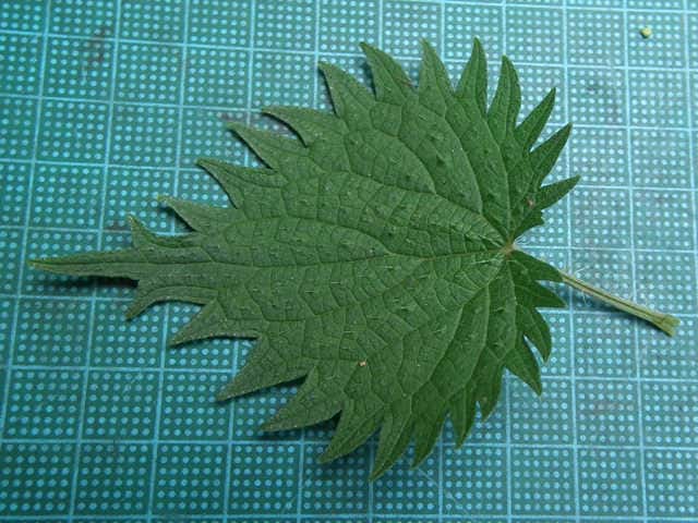 | ▼葉の基部は心形。 | ▼葉は長さ約8cm。 | ▼表面には刺毛がある。 |