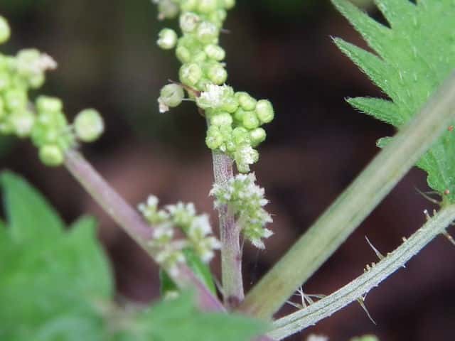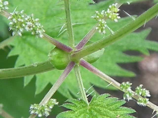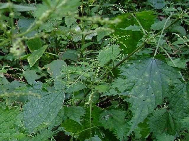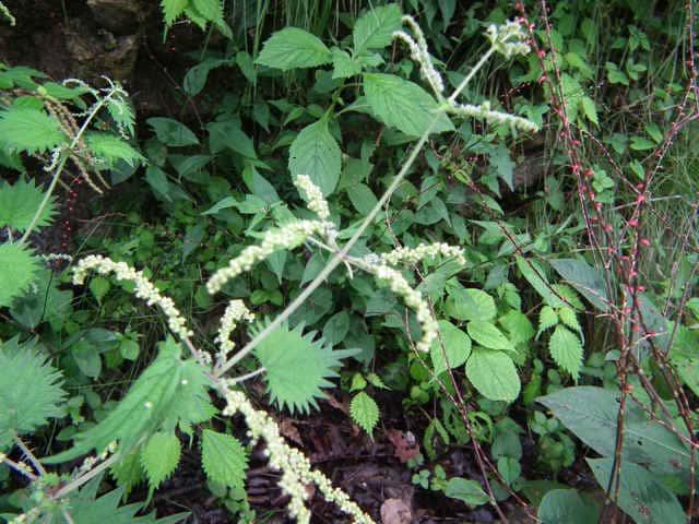| 多年草 本州〜九州の山地の木陰などに生える。高さ0.4 〜1m。茎は四角形で茎や葉に蟻酸を含む棘が多く、刺さると痛い。葉は対生し、長さ5〜12cmの広卵形で、欠刻状鋸歯がある。雌雄同株。茎頂部に雌花穂がつく。花被片は4個で、花後に2個が大きくなる。花柱は1個。雄花序はやや下部につき、淡緑色で、花弁はなく萼片は4個、雄しべは4個。花期は9〜10月。(山に咲く花) 学名は、Urtica thunbergiana イラクサ科イラクサ属 よく似たミヤマイラクサ、ムカゴイラクサは葉が互生する。 |
