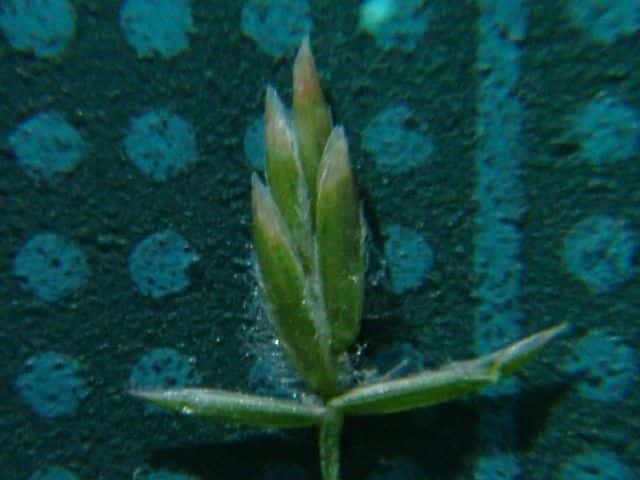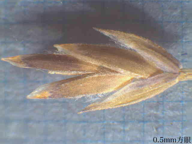 | ▼3小花の小穂は長さ約4.5mm。 | ▼第1苞穎は長さ約2.5mm、第2苞穎は2.7mm。 | ▼小花の護穎の基部に長い縮れ毛がある。 |