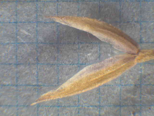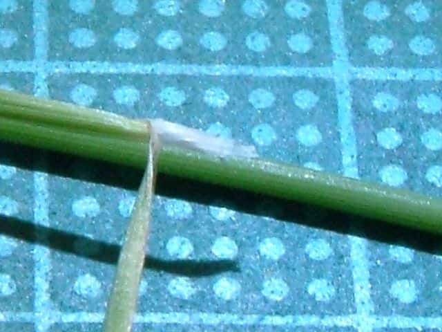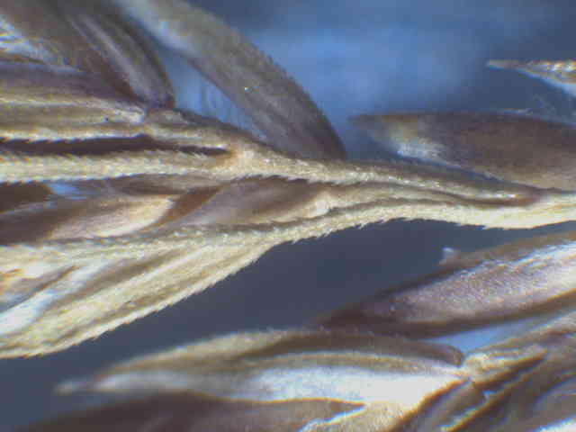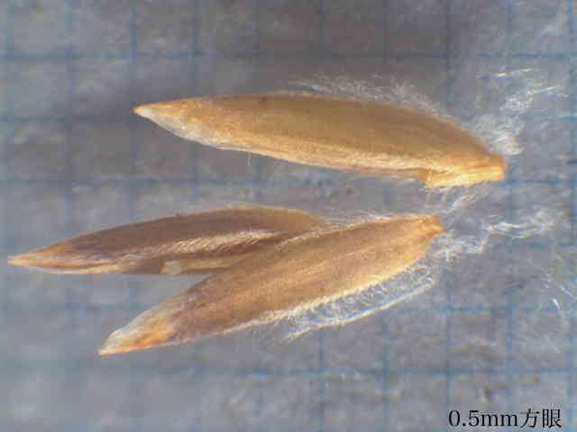 | ▼第1小花は長さ約2.7mm、護穎の竜骨に長毛がある。 | ▼護穎基部の縮れ毛と、竜骨の長毛。 | ▼葉舌は3mm以上ある。 |