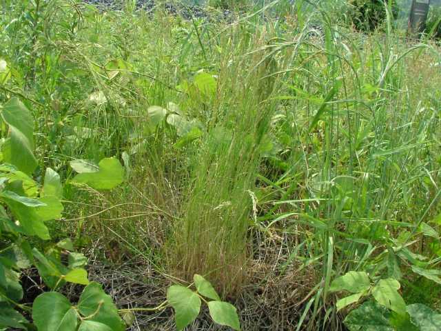 | 多年草 北海道〜九州の堤防や路傍に多く生育する。茎は高さ30〜70cm、直立・叢生する。葉は長さ10〜15cm、幅2〜3mm、粉緑色を帯びざらつく。葉舌は鋭形、白く薄膜質、長さ3〜6mm。葉鞘はざらつき、無毛。花序は直立し長さ5〜15cm、枝は3〜6個、長短不同、斜上しざらつく。小穂は淡緑色、卵形、長さ4〜5mm、3〜6小花からなる。護穎の中央脈上に寝た毛があり、基部に長い縮れ毛を生じる。花期は5〜6月。(日本イネ科植物図譜) 学名は、Poa sphondylodes イネ科イチゴツナギ属 よく似たものにオオスズメノカタビラがある。 |