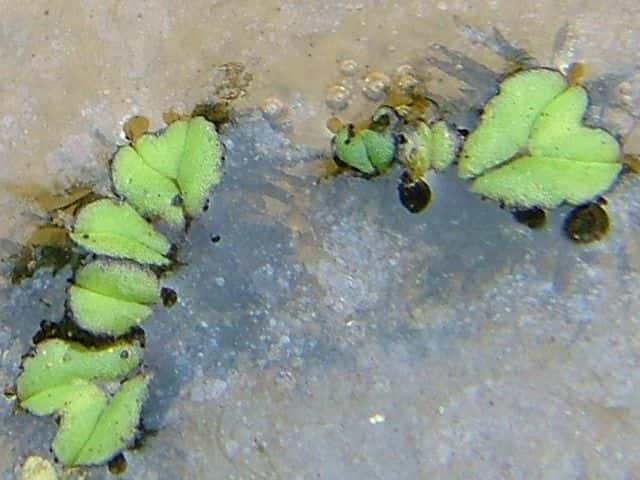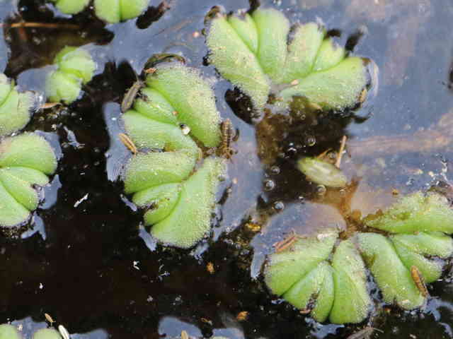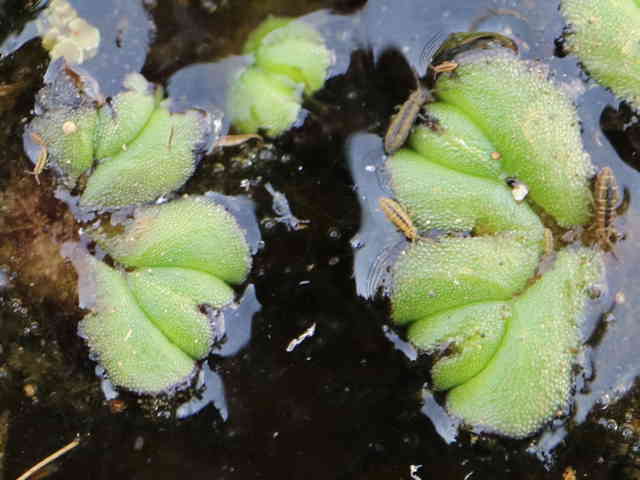 | コケ類 北海道〜九州の水田に見られる日本で唯一の浮遊性のコケ。葉状体がイチョウの葉に似ている。二又状に分岐し、葉状体が半円以上に生長すると中央から分裂し増殖する。水がなくなると地上型になる。 学名は、Ricciocarpus natans ウキゴケ科 イチョウウキゴケ属 |