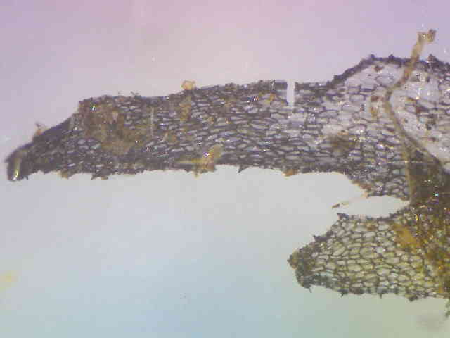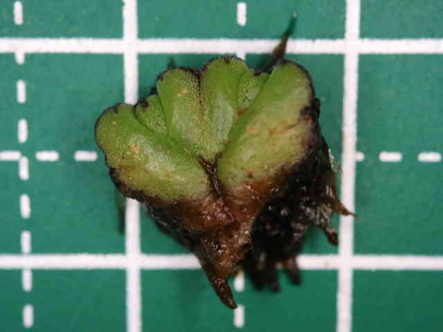 | ▼葉状体は長さ約8mm。 | ▼裏面には仮根状の鱗片が無数にある。 | |