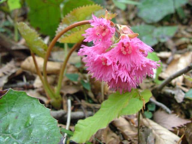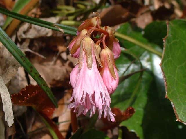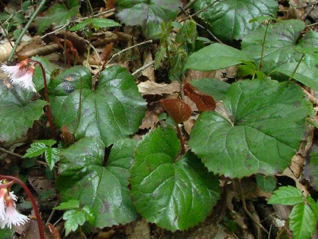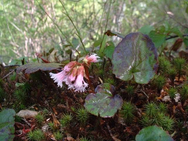 北海道〜九州の山地の岩場や高山の草地に生える。葉は根ぎわに集まってつき、長い柄がある。葉身は長さ幅とも3〜6cmの円形で、とがった鋸歯があるが、先端はとくにとがらない。表面に光沢がある。葉の間から高さ10〜20cmの花茎をのばし、先に淡紅色の花を3〜6個つける。花冠は直径1〜1.5cm、ふちは細かく裂ける。花期は4〜7月。(山に咲く花)