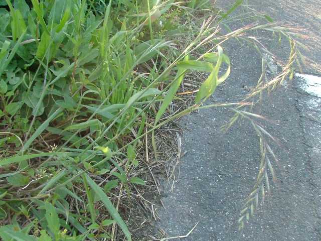 多年草 北海道〜沖縄の路傍や原野に生育する。根茎は短く、ほふく根茎はない。茎は直立・叢生し基部は屈曲する。茎は高さ50〜100cm。葉は長さ15〜25cm、幅5〜10mm、無毛。花序は穂状、紫色を帯びた緑白色、長さ15〜30cm、先は下垂する。小穂は長楕円形、花序の節に交互に単生し、長さ14〜17mm、5〜8小花がある。小花は長さ9.5〜11mm。包穎は披針形、第1包穎は長さ5〜6mm、第2包穎は7〜8.5mm。護穎と内穎はほとんど等長。護穎は広披針形、長さ9〜10mm、芒は長さ2〜3cm、無毛。果実は倒披針形、淡黄色・無光沢、腹面はくぼみ長さ5〜5.5mm。花期は6月。(日本イネ科植物図譜) 学名は、Elymus tsukushiensis var. transiens イネ科エゾムギ属 よく似たものにアオカモジグサがある。 |