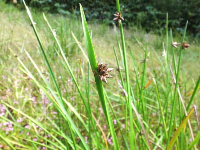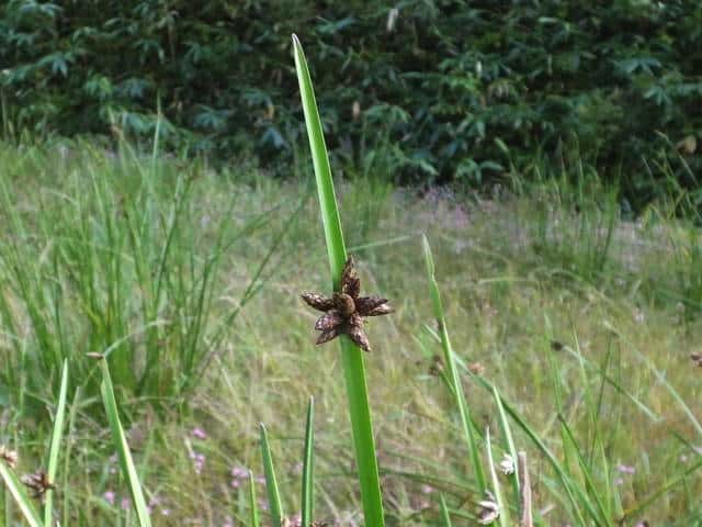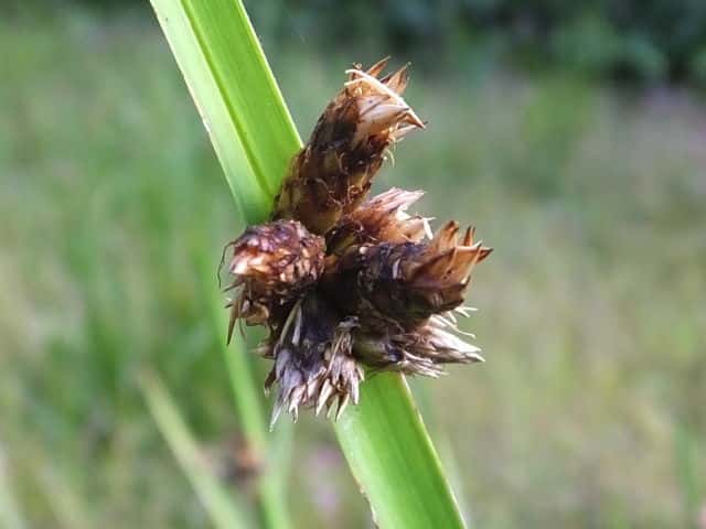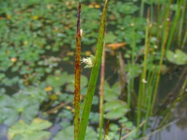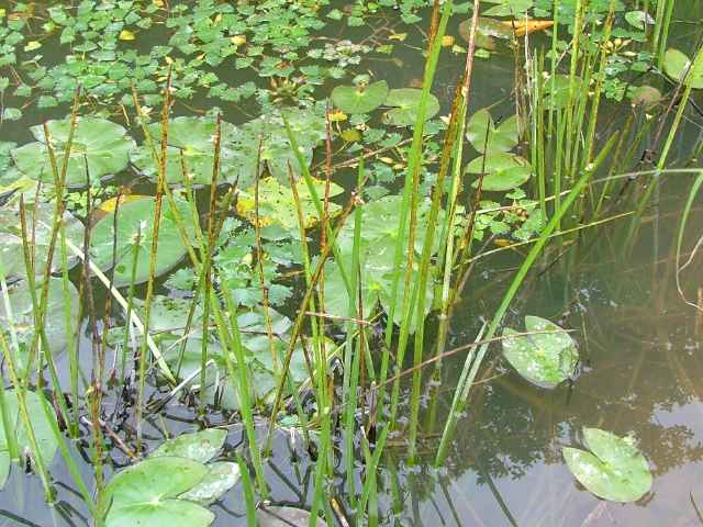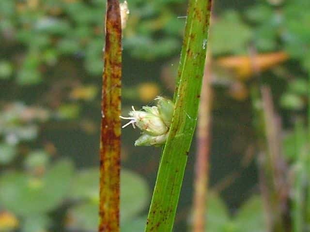 多年草 北海道〜九州の池沼などの湿地に多い。植物体は叢生し、ときに短い横走根茎を持つ。稈は高さ50〜120cm、横断面は鋭3稜形、平滑、濃緑色。花序は側生し、無柄の小穂が4〜20個集まって頭状をなす。苞葉の葉身は稈に続き、長さ3〜10cm、斜上する。小穂は長卵形、長さ1〜2cm、鋭頭、淡緑色。鱗片は密に圧着し、卵形、長さ4〜5mm、上部の縁はざらつく。葯は線形で長さ約2.5mm。そう果は広倒卵形長さ2〜2.5mm、横断面は扁3稜形。刺針状花被片は5〜6本、長さはそう果の1.5〜2倍、下向きにざらつく。柱頭は3個。花期は7〜10月。(岡山県カヤツリグサ科植物図譜) 学名は、Schoenoplectus triangulatus カヤツリグサ科ホソガタホタルイ属 よく似たサンカクイは、花序に柄がある。 |