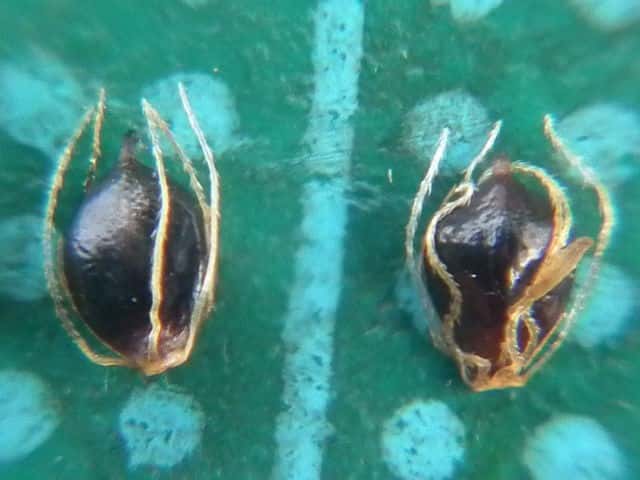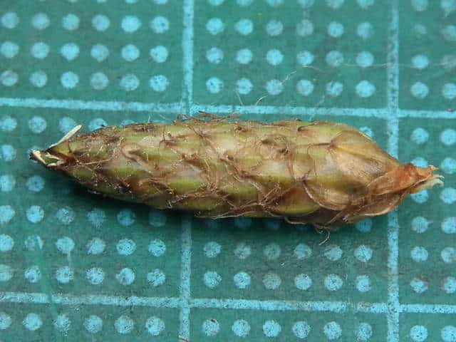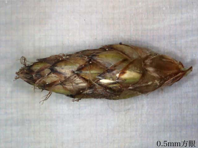 | ▼鱗片の上縁に歯牙状の突起が並ぶ。 | ▼刺針状花被片は果実の長さの2倍程度。 | ▼刺針状花被片には下向きの刺がある。 |