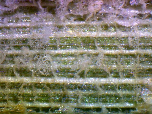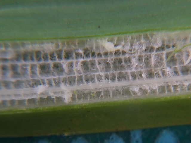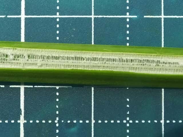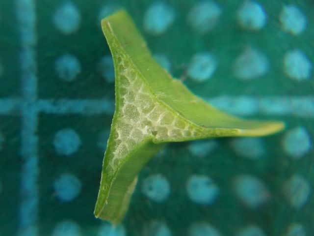 | ▼茎の横断面。鋭い3稜がある。 | ▼茎の縦断面。 | |