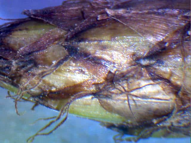 | ▼小穂は長さ約15mm。 | ▼柱頭は3岐する。 | ▼鱗片は長さ約5.5mm、先は短い芒となる。 |