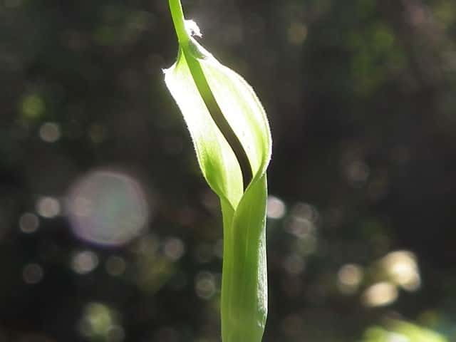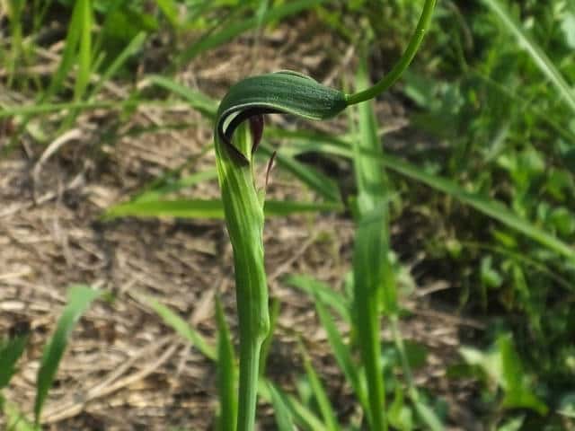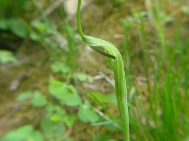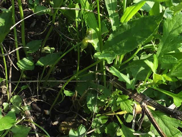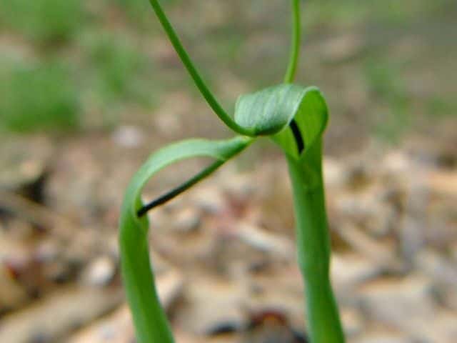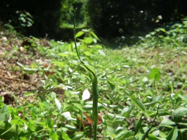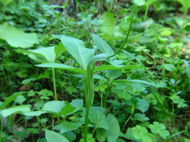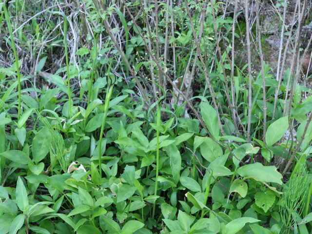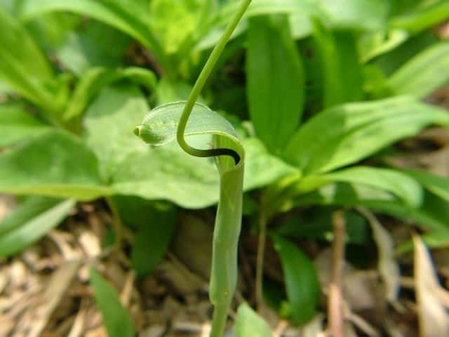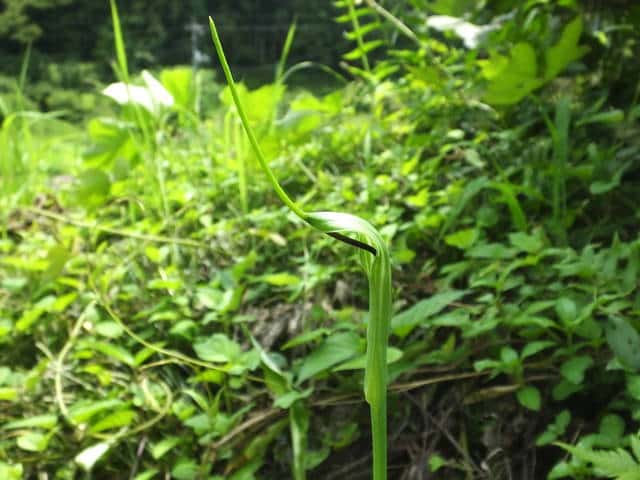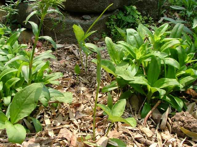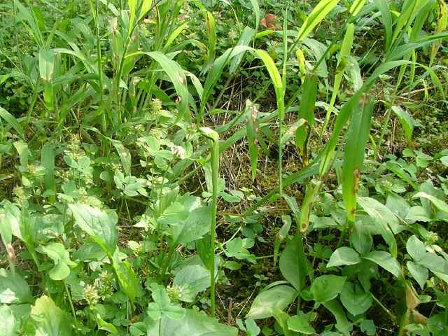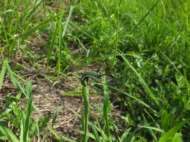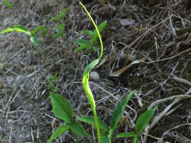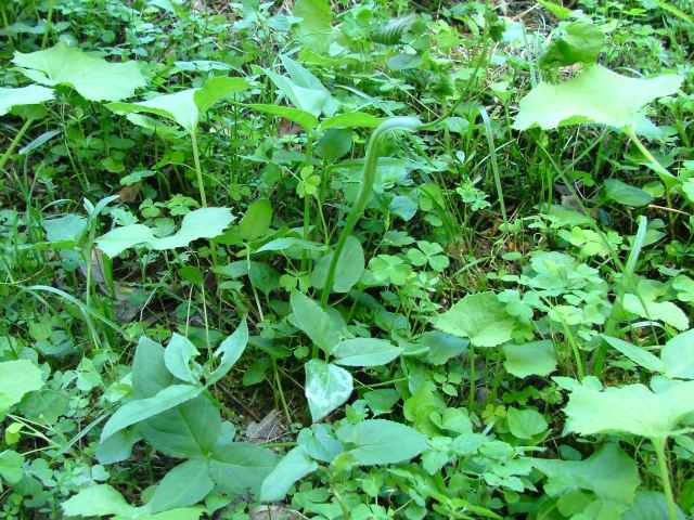 多年草 日本全土の畑の雑草としてふつうに生える。葉は1〜2個根生し、3小葉からなる。小葉は長さ5〜11cmの楕円形〜長楕円形で先はとがる。葉柄の途中と小葉の基部に珠芽(ムカゴ)をつけ、これで増える。花茎は高さ20〜40cmで葉より高く、緑色または帯紫色の仏炎苞に包まれた肉穂花序をつける。仏炎苞は長さ5〜6cmで、舷部の内側には短毛が密生する。花序の付属体は長く糸状にのび、仏炎苞の外にでて直立する。果実は液果で緑色。花期は5〜8月。(野に咲く花) 学名は、Pinellia ternata サトイモ科ハンゲ属 |