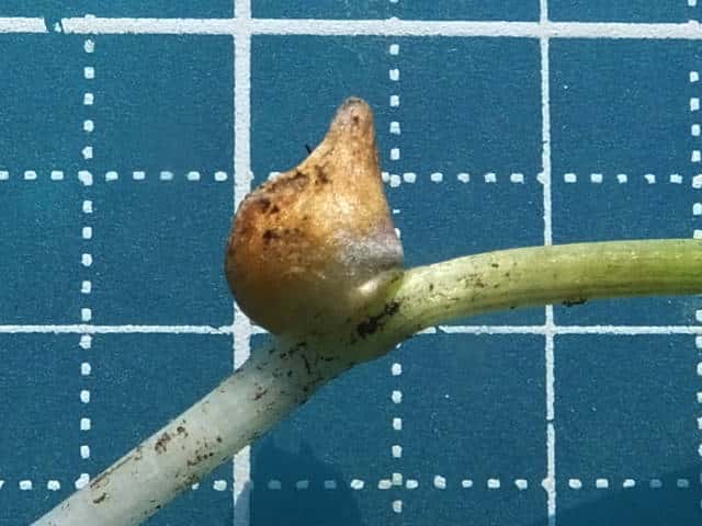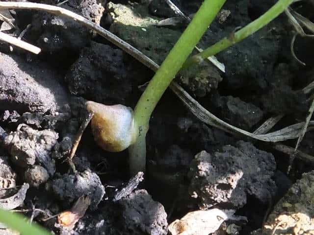 | ▼葉柄下部にできた珠芽(むかご)。 | ▼珠芽(むかご)は長さ約8mm。 | |