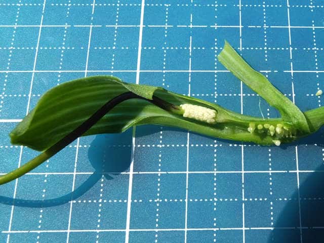 | ▼2015年8月23日 大野 | ▼仏炎苞を広げると果実がだいぶ大きくなってきていた。 | |