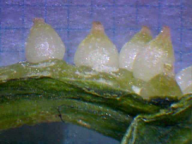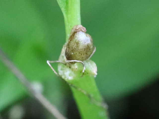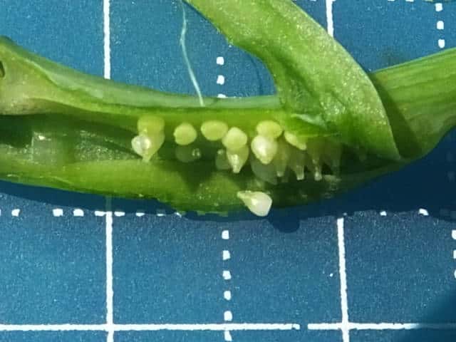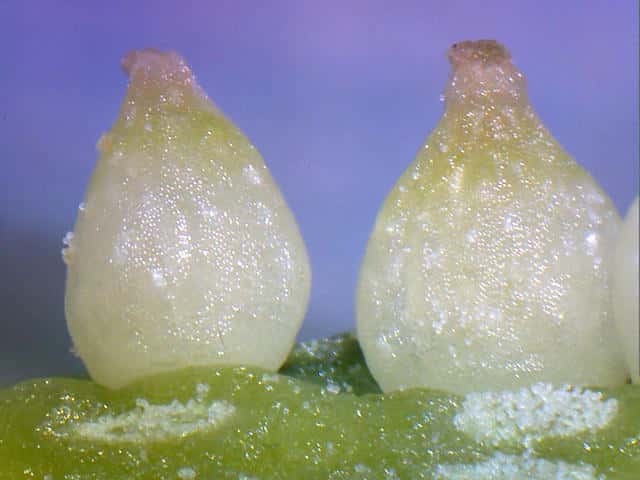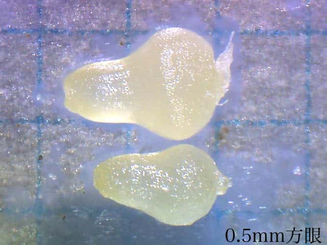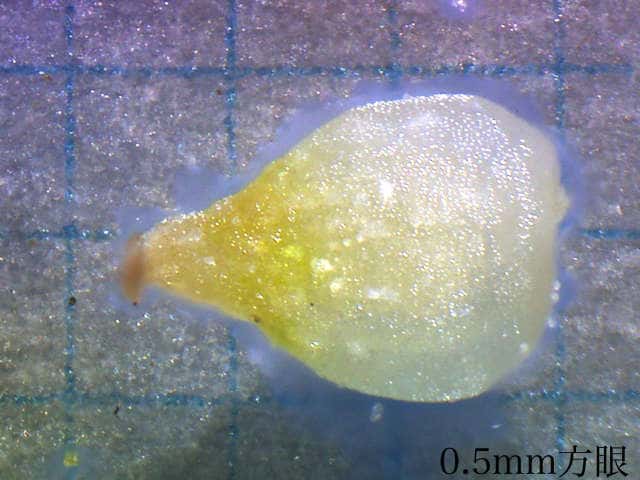 | v若い果実は長さ約1.3mm。種子が1個入る。 | ▼未熟な種子は長さ約0.7〜0.8mm。 | |