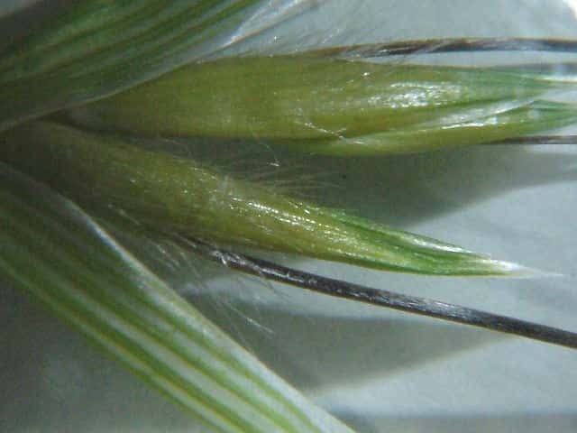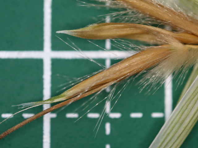 | ▼3小花の小穂、第3小花の芒は短い。苞穎は長さ約2.5cm。 | ▼2小花の小穂。 | ▼小花の基部と護穎に長毛がある。 |