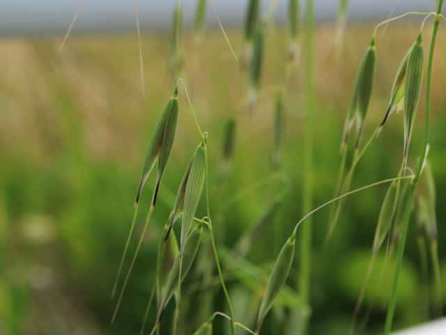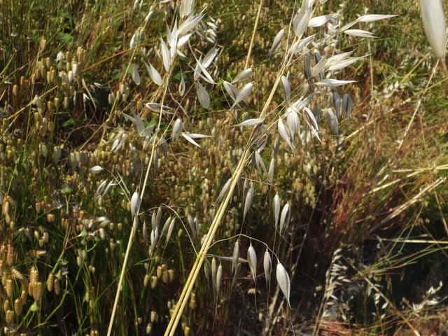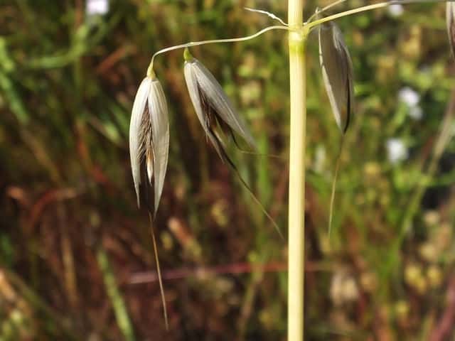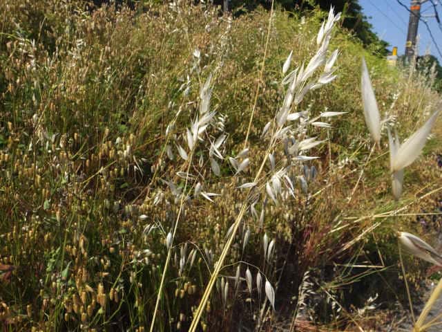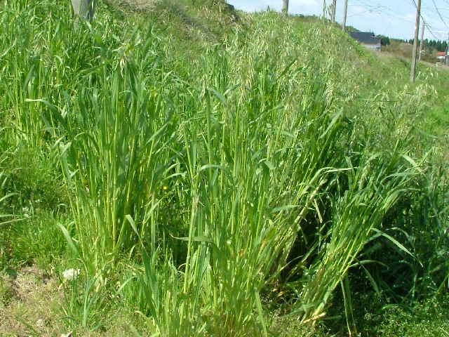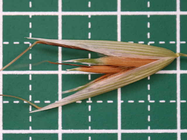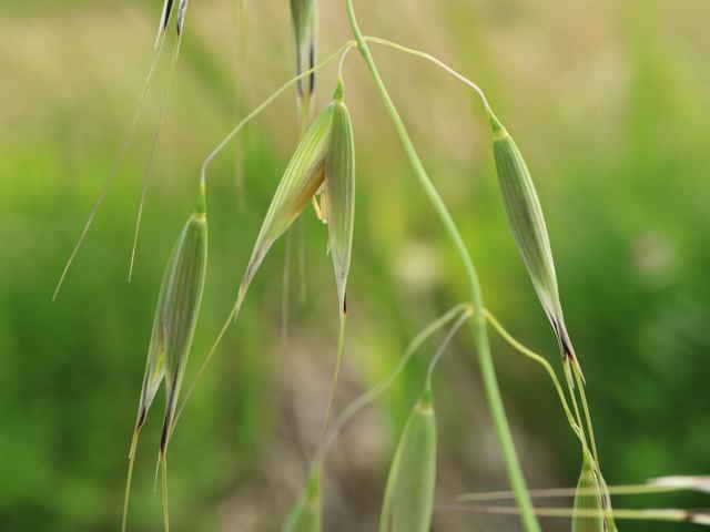 | 1〜越年草 ヨーロッパ原産。本州〜沖縄の路傍や荒廃地に生育し、散生またはやや群生する。茎は中空、直立・叢生する。高さ60〜80cm。葉の長さ10〜25cm、幅4〜6mm。無毛。葉舌は鈍形、不規則に細裂する。葉鞘は無毛。花序はまばらな円錐形、長さ10〜20cm。小穂は長楕円形、長さ20〜25mm、2〜3個の小花からなる。苞穎は大きく、長さ20〜23mm。護穎は黄褐色、粗い長毛があリ、背面に暗褐色の屈曲した芒をつける。果実は長楕円形、腹面は扁平、淡黄褐色の毛が生え、長さ7〜8mm。花期は6〜7月。(日本イネ科植物図譜) 学名は、Avena fatua イネ科カラスムギ属 護頴に毛のないタイプをコカラスムギということもあるが、区別しないのが普通だという。 ミナトカラスムギは護穎の先端が深裂し芒状になる。 似たものにマカラスムギがあり、芒が1本あるか又は全くない。 |