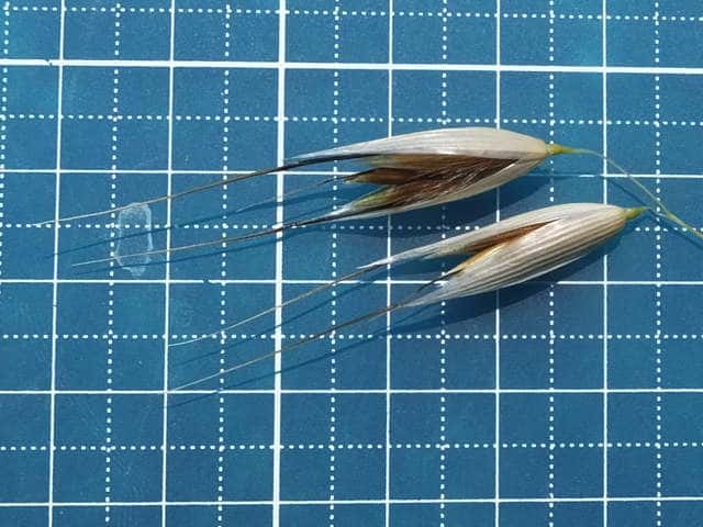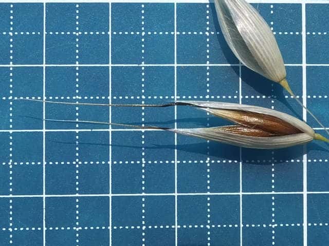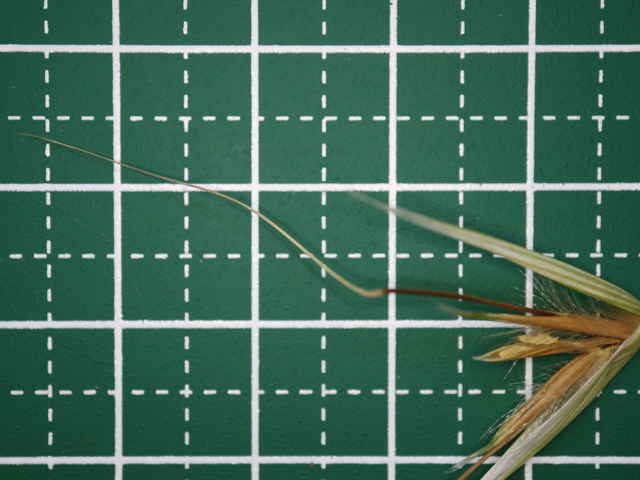 | ▼小花の基部と護穎の長毛。 | ▼護穎の中部から伸びる芒は長さ約4.3cm。 | |