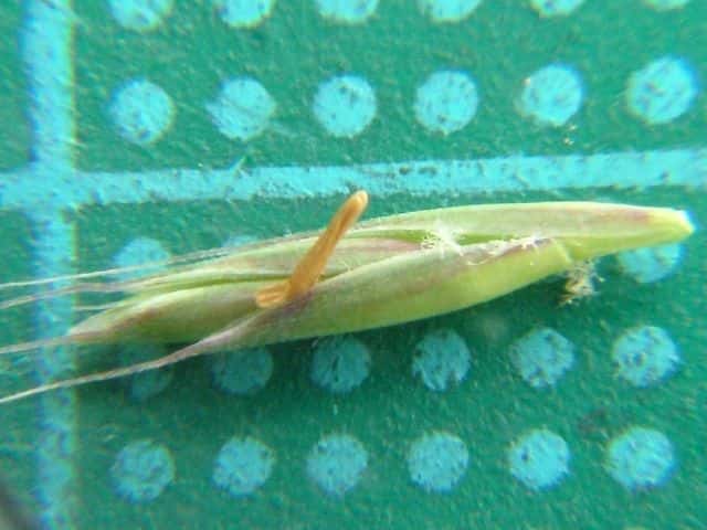 | ▼小花は5〜7個。 | ▼苞穎と第1小花。護穎の先から芒がでる。 | |