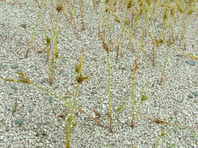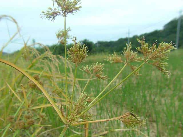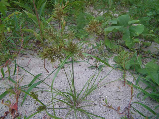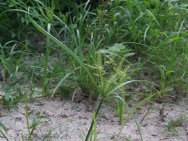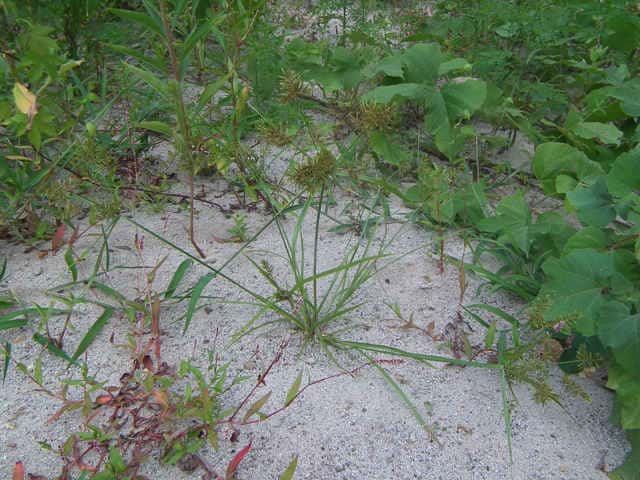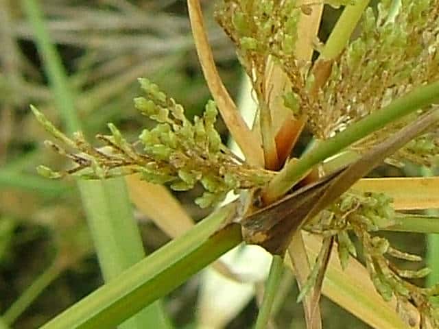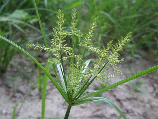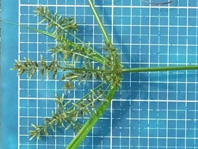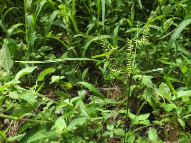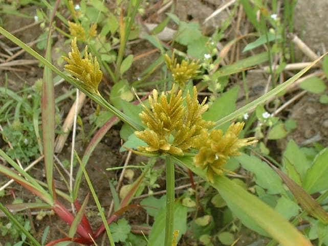 | 1年草 本州〜九州の路傍や田畑に普通に見られる。稈は高さ20〜50cm、細くて硬い。葉は稈より短く、幅2〜4mm。花序は散形で複生。花序枝を5〜10本出し、長いものは10cmに達す。苞葉の葉身は4〜6枚、うち3〜4枚は花序よりはなはだ長い。花穂や小穂の中軸には翼があり、小穂はまばらにつき、黄褐色、3〜4個が掌状に集まって花序をつくる。小穂は線形、長さ7〜10mm、やや開出し、黄褐色、15〜20個の花をつける。鱗片は広倒卵形、長さ1.4mm、鋭頭、先端は短い凸端となる。そう果は倒卵形、鱗片より少し短く、長さ1.3mm。花柱ははなはだ短く、柱頭は3個。花期は8〜10月。(岡山県カヤツリグサ科植物図譜) 学名は、Cyperus microiria カヤツリグサ科カヤツリグサ属 チャガヤツリとよく似るが、カヤツリグサは花序が複生し、鱗片の先が短い凸端となり、小穂が黄色味を帯びることで区別できる。 |