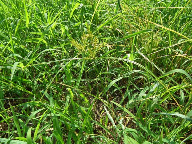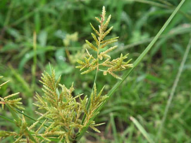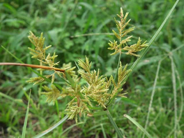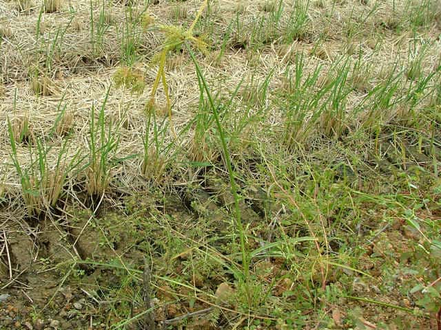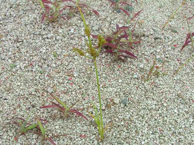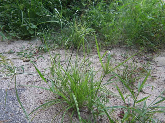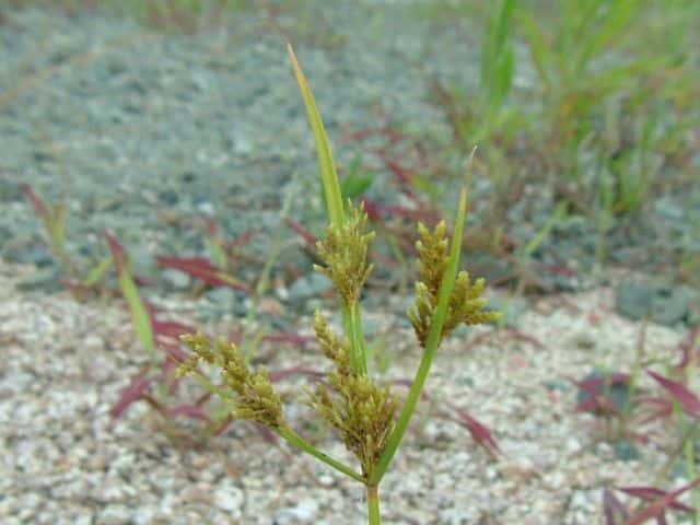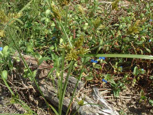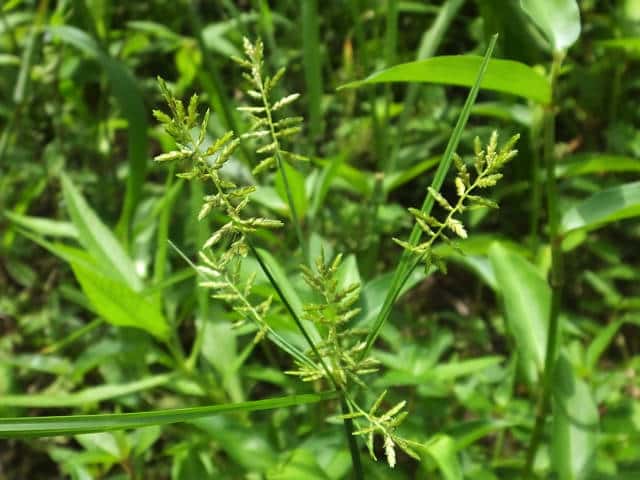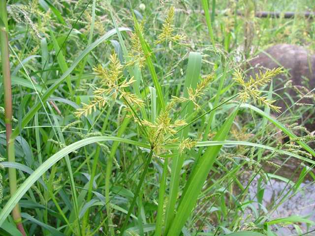 | 1年草 本州〜九州の路傍や田畑に普通に見られる。稈は高さ20〜50cm、細くて硬い。葉は稈より短く、幅2〜4mm。花序は散形で複生。花序枝を5〜10本出し、長いものは10cmに達す。苞葉の葉身は4〜6枚、うち3〜4枚は花序よりはなはだ長い。花穂や小穂の中軸には翼があり、小穂はまばらにつき、黄褐色、3〜4個が掌状に集まって花序をつくる。小穂は線形、長さ7〜10mm、やや開出し、黄褐色、15〜20個の花をつける。鱗片は広倒卵形、長さ1.4mm、鋭頭、先端は短い凸端となる。そう果は倒卵形、鱗片より少し短く、長さ1.3mm。花柱ははなはだ短く、柱頭は3個。花期は8〜10月。(岡山県カヤツリグサ科植物図譜) 学名は、Cyperus microiria カヤツリグサ科カヤツリグサ属 チャガヤツリとよく似るが、カヤツリグサは花序が複生し、鱗片の先が短い凸端となり、小穂が黄色味を帯びることで区別できる。 |
