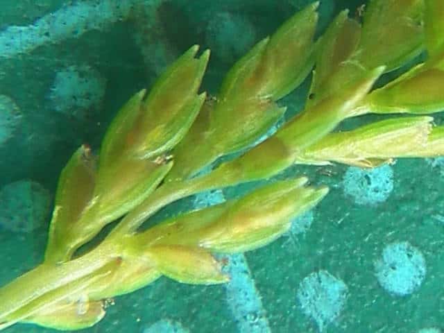 | ▼小穂のつく軸に狭い翼がある。 | ▼小穂は長さ約5mm、鱗片中肋は突出する。 | |
