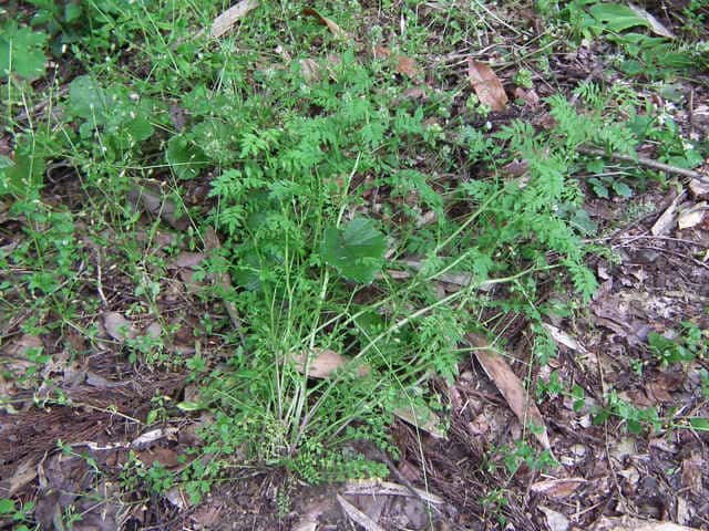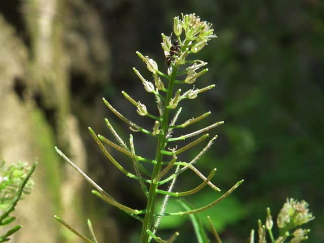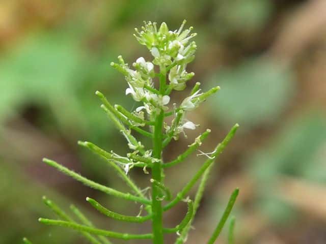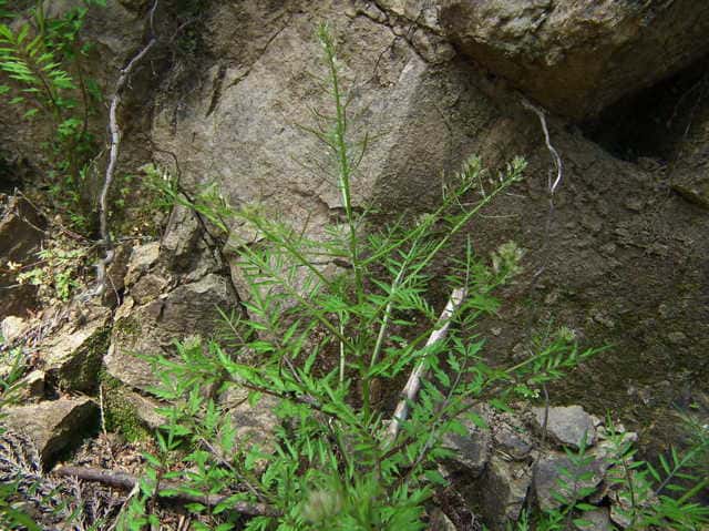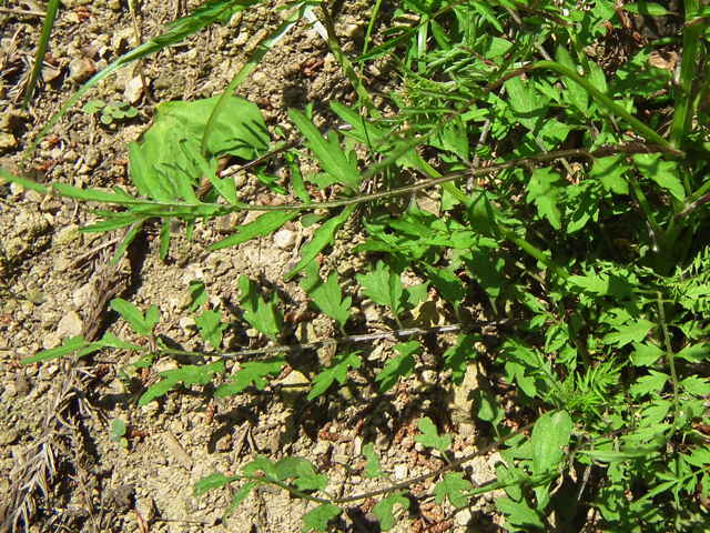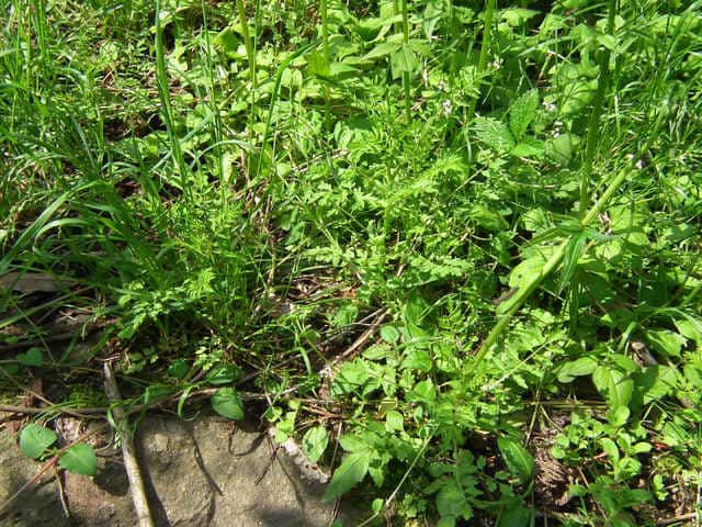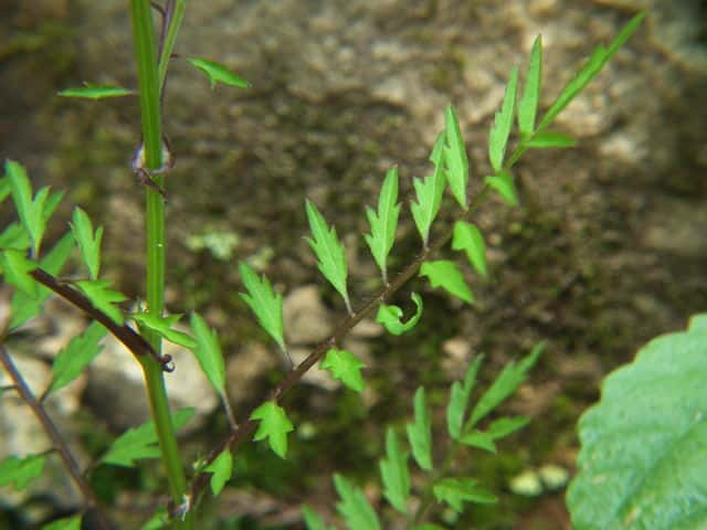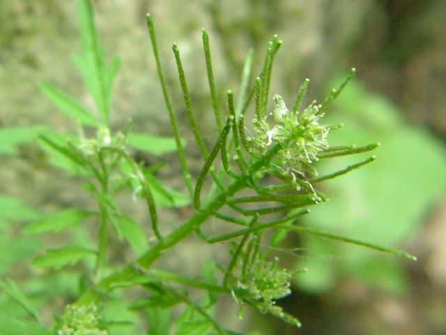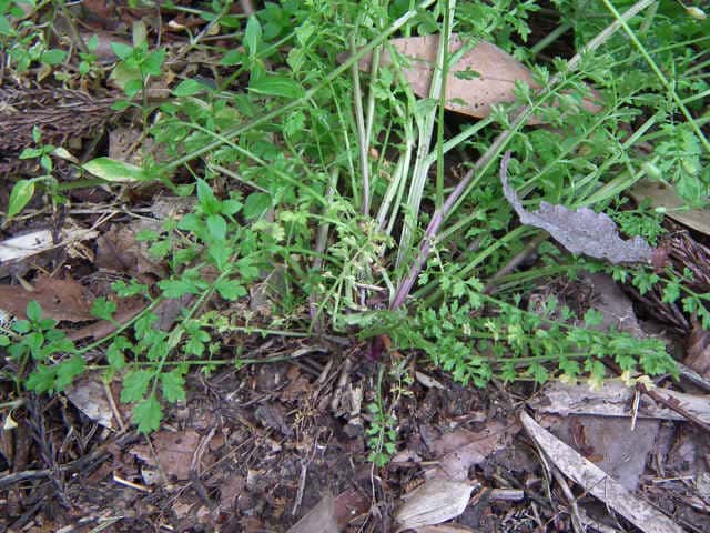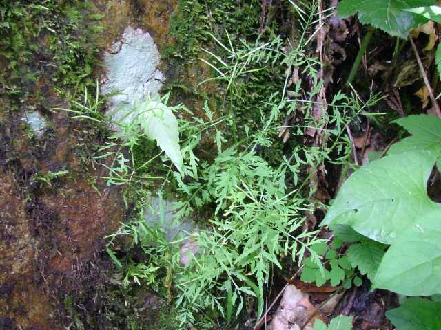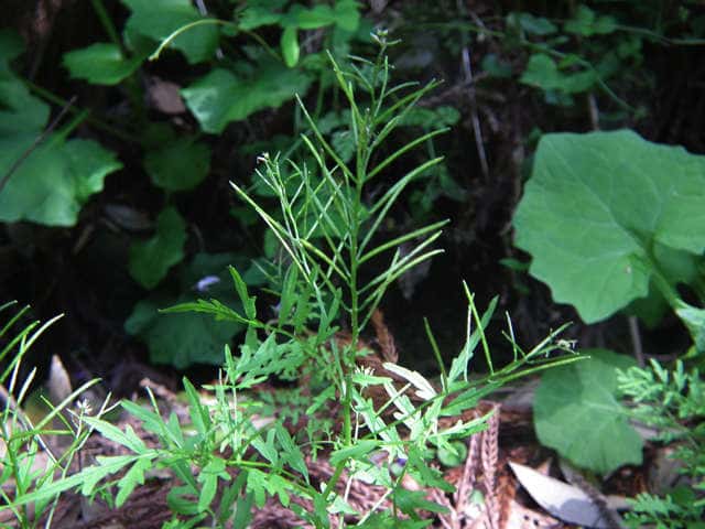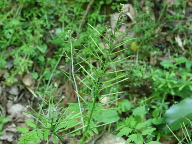 1〜越年草 北海道〜九州にあり、木陰や水辺のやや湿った場所に生える。茎は直立してしばしば下部で枝を分け、無毛か基部近くに多少毛があり、高さ12〜80cmになる。葉は薄く羽状に複生し、根出葉はロゼット状、しばしば花時には枯れ、茎葉は根出葉よりも大きく、葉柄の基部には尖った小さい耳部がある。小葉は4〜10対、下部の茎葉では卵形で有柄、欠刻状の深い鋸歯があり、上部の茎葉では披針形で無柄、浅い鋸歯がある。総状花序は果時に伸びる。萼片は広線形でで長さ1.2〜2mm。花弁は白色、長楕円状へら形で、長さ2〜3.5mm、ときに退化する。果柄は長さ4〜10mmで斜上し、長角果は直立して線形、長さ15〜25mm、無毛か斜上する剛毛を散生する。種子は長楕円形、長さ約1.3mm、先端に狭い翼がある。長角果が有毛のものをケジャニンジン、無毛のものをキタノジャニンジンとして区別する意見もあるが、分布も異ならないのでここではまとめておく。花期は3〜6月。(日本の野生植物) 学名は、Cardamine impatiens var. impatiens アブラナ科タネツケバナ属 |