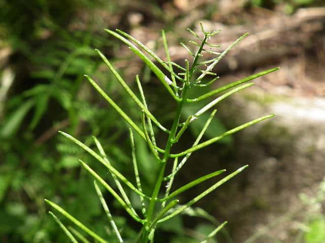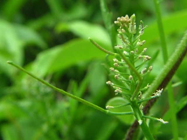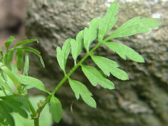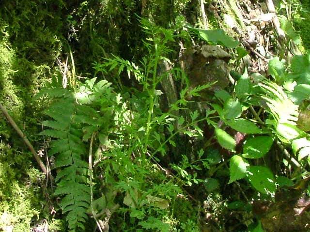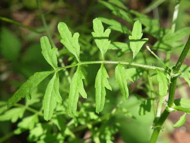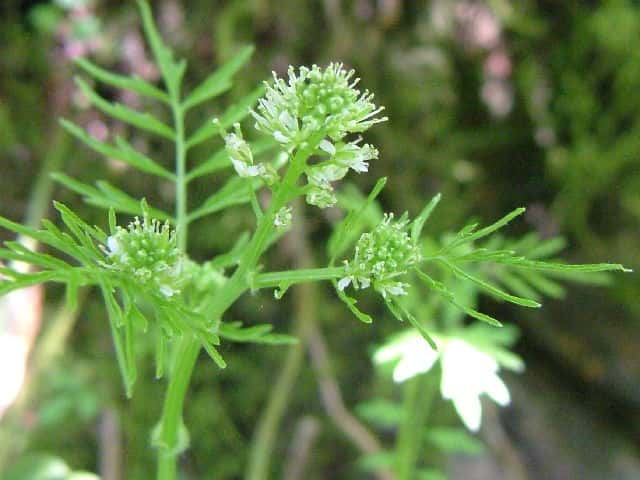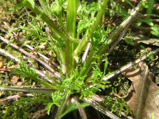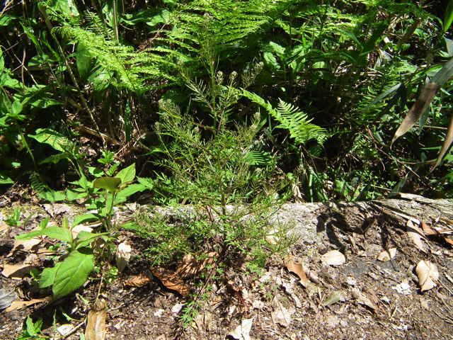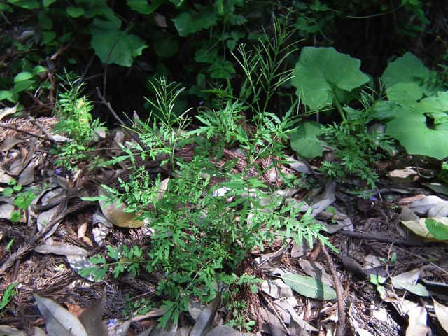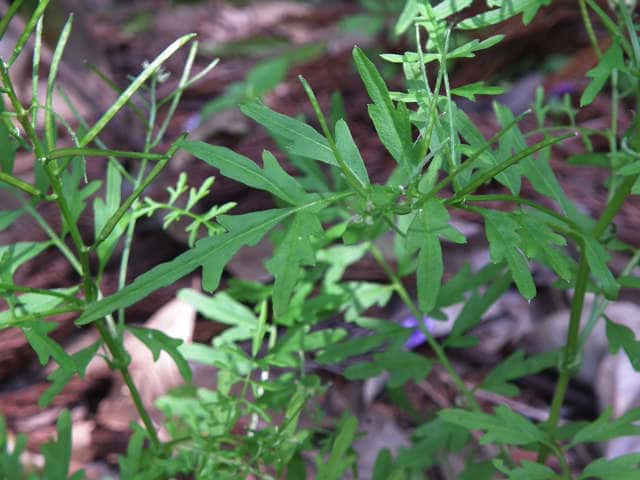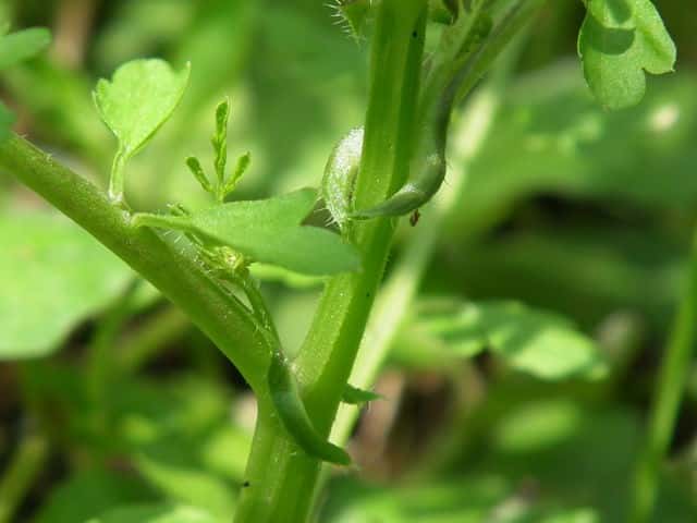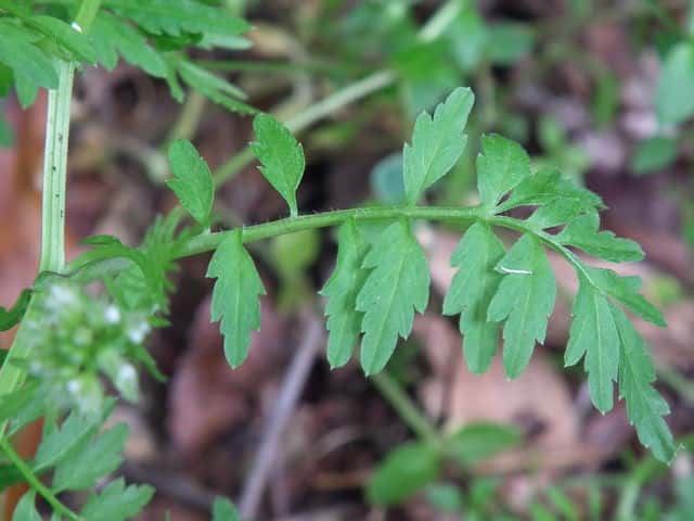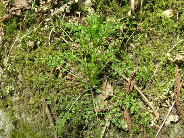 1〜越年草 北海道〜九州にあり、木陰や水辺のやや湿った場所に生える。茎は直立してしばしば下部で枝を分け、無毛か基部近くに多少毛があり、高さ12〜80cmになる。葉は薄く羽状に複生し、根出葉はロゼット状、しばしば花時には枯れ、茎葉は根出葉よりも大きく、葉柄の基部には尖った小さい耳部がある。小葉は4〜10対、下部の茎葉では卵形で有柄、欠刻状の深い鋸歯があり、上部の茎葉では披針形で無柄、浅い鋸歯がある。総状花序は果時に伸びる。萼片は広線形でで長さ1.2〜2mm。花弁は白色、長楕円状へら形で、長さ2〜3.5mm、ときに退化する。果柄は長さ4〜10mmで斜上し、長角果は直立して線形、長さ15〜25mm、無毛か斜上する剛毛を散生する。種子は長楕円形、長さ約1.3mm、先端に狭い翼がある。長角果が有毛のものをケジャニンジン、無毛のものをキタノジャニンジンとして区別する意見もあるが、分布も異ならないのでここではまとめておく。花期は3〜6月。(日本の野生植物) 学名は、Cardamine impatiens var. impatiens アブラナ科タネツケバナ属 |