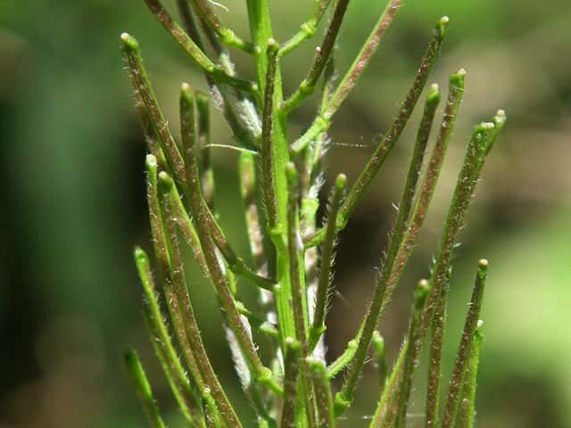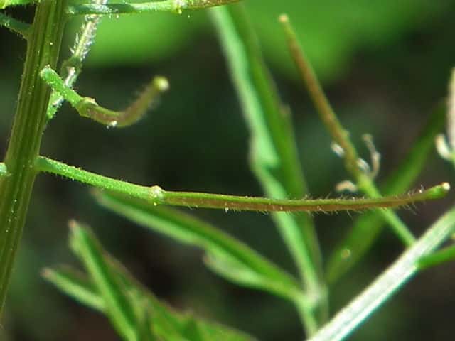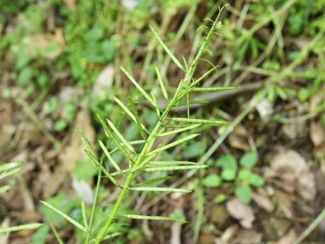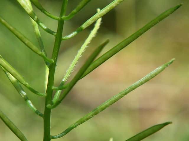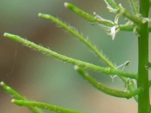 | ▼2007年5月5日 東長江 花弁が退化することがあり、花があまり見えない。 | ▼長角果に毛が生えている。 | |