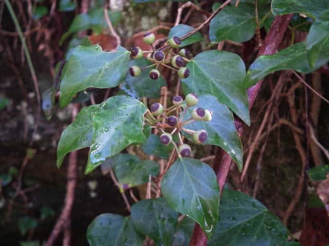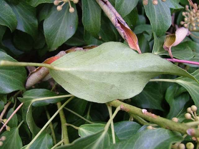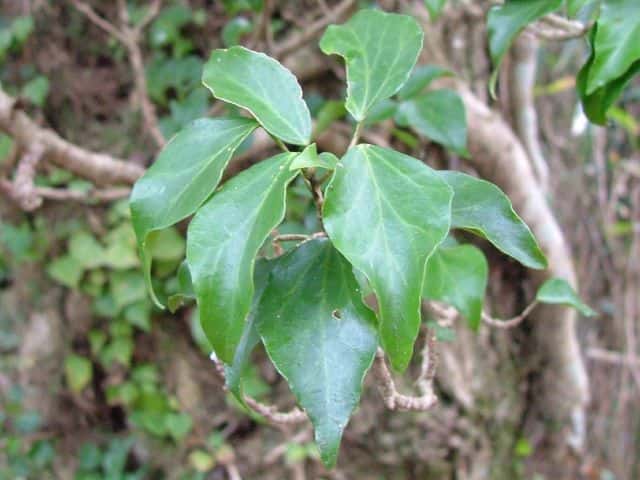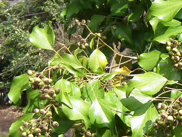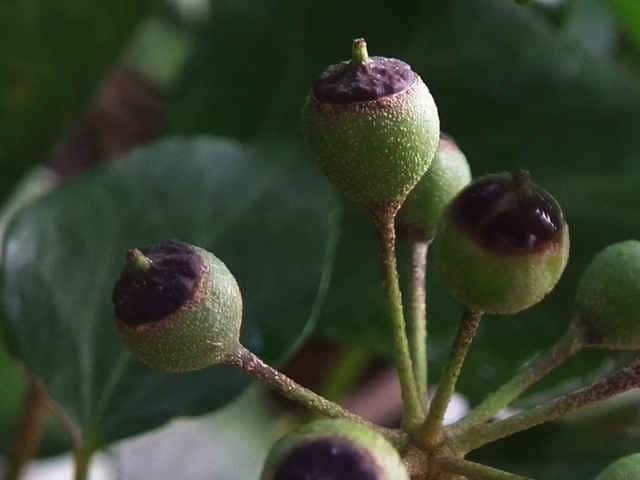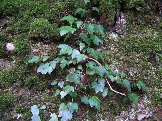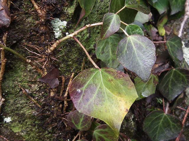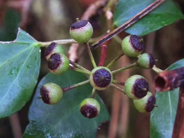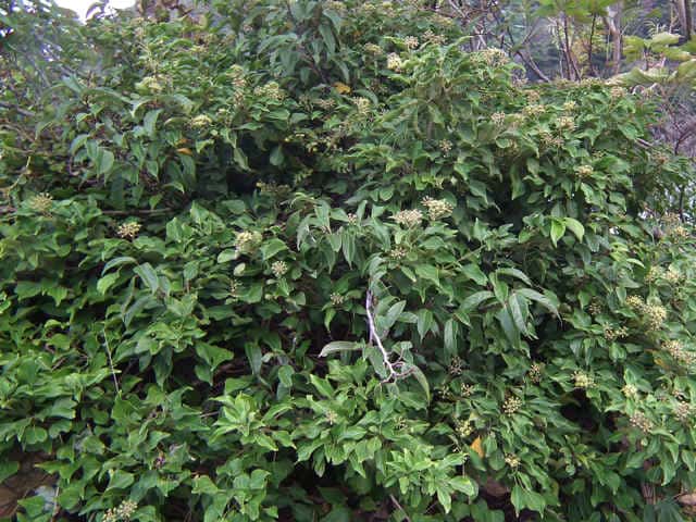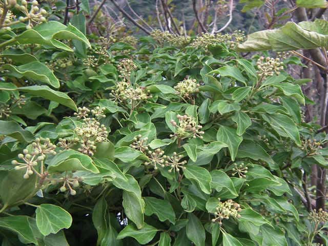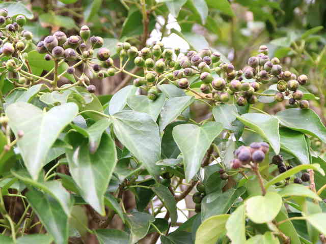 | 常緑つる性木本 本州〜九州の照葉樹林の林縁や林内、原野などに生える。気根をだして、樹木や岩の上などにはい登る。大きいものは太さが直径6cm以上になる。樹皮は灰色で皮目がある。本年枝は緑色。はじめ黄褐色の微細な星形の鱗状毛があるが、のち無毛になる。葉は互生。葉身は長さ3〜7cm、幅2〜4cmの三角形または五角形状で、基部は切形またはハート形。花序のつく枝の葉は倒卵形または楕円形で、分裂しない。ふちは全縁。花のつかない枝の葉は浅く3〜5裂する。革質で、表面は光沢がある。若い葉にははじめ褐色の小さな星形の鱗状毛があるが、のちに無毛になる。枝先に直径2.5〜3cmの球形の散形花序を1個または数個だし、黄緑色の小さな花を多数つける。花は直径1cmほどで、花弁は5個、長さ約4mmの長卵形でそり返る。花盤は暗紅色。雄しべは5個。葯は黄色で裂開すると褐色になる。萼筒は鐘形、鱗状毛が生える。果実は液果。直径8〜10mmのほぼ球形、はじめ赤紫褐色で、翌年の5〜6月に紫黒色に熟す。先端には花柱が残る。直径約5mmの扁球形の種子が5個入っている。花期は10〜12月。別名 フユヅタ。 冬芽の頂芽は半球形またはやや扁平な三角形で、紅紫色を帯びる。側芽は小さくて丸みのある扁平な三角形。葉痕葉三日月形、維管束痕は5個。(樹に咲く花) 学名は、Hedera rhombea ウコギ科キヅタ属 よく似たセイヨウキヅタは、若い葉柄や葉裏に長くて白い毛がある。 |