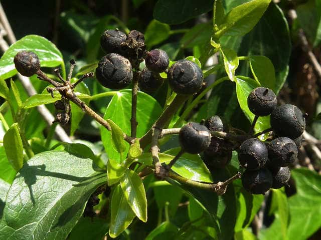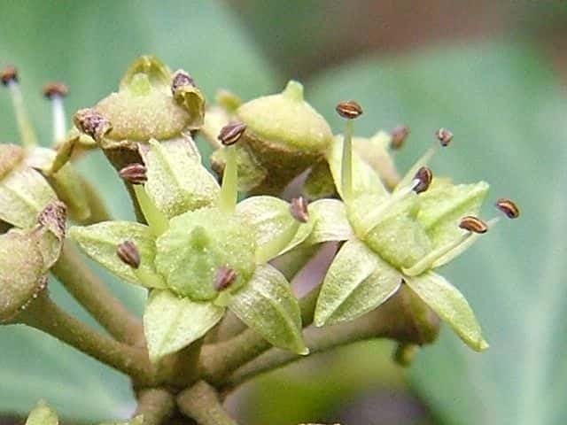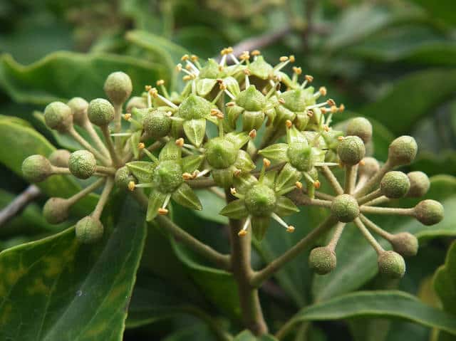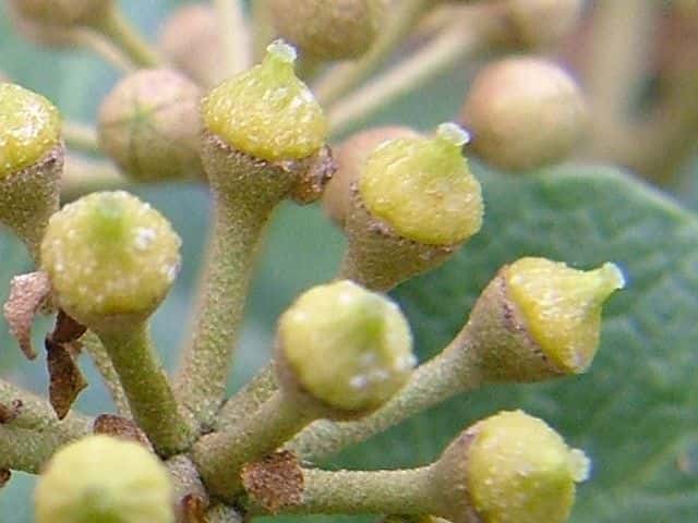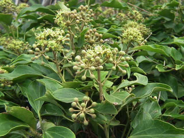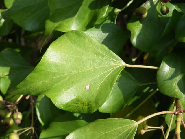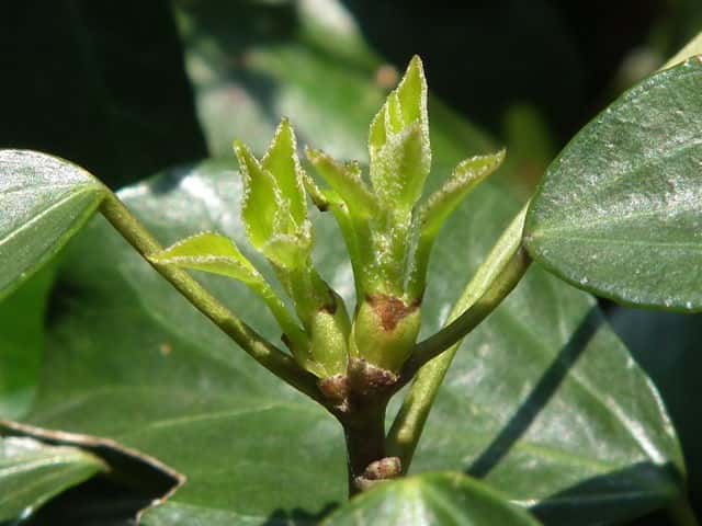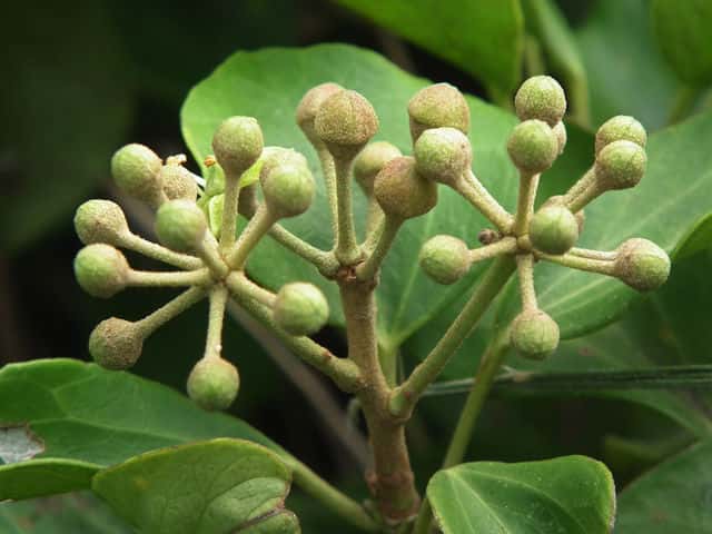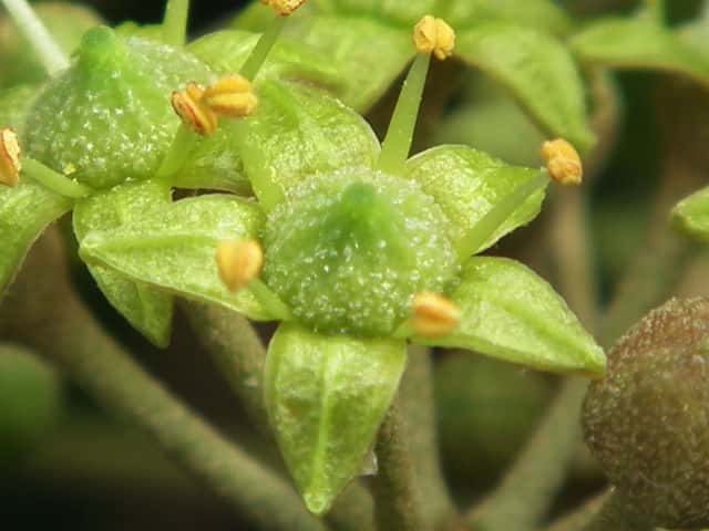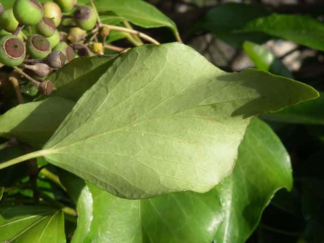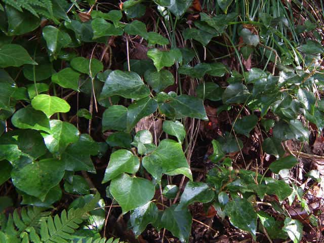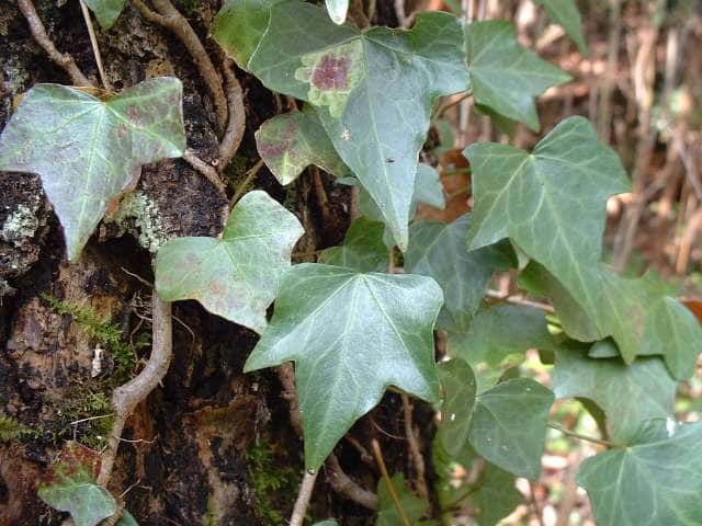 | 常緑つる性木本 本州〜九州の照葉樹林の林縁や林内、原野などに生える。気根をだして、樹木や岩の上などにはい登る。大きいものは太さが直径6cm以上になる。樹皮は灰色で皮目がある。本年枝は緑色。はじめ黄褐色の微細な星形の鱗状毛があるが、のち無毛になる。葉は互生。葉身は長さ3〜7cm、幅2〜4cmの三角形または五角形状で、基部は切形またはハート形。花序のつく枝の葉は倒卵形または楕円形で、分裂しない。ふちは全縁。花のつかない枝の葉は浅く3〜5裂する。革質で、表面は光沢がある。若い葉にははじめ褐色の小さな星形の鱗状毛があるが、のちに無毛になる。枝先に直径2.5〜3cmの球形の散形花序を1個または数個だし、黄緑色の小さな花を多数つける。花は直径1cmほどで、花弁は5個、長さ約4mmの長卵形でそり返る。花盤は暗紅色。雄しべは5個。葯は黄色で裂開すると褐色になる。萼筒は鐘形、鱗状毛が生える。果実は液果。直径8〜10mmのほぼ球形、はじめ赤紫褐色で、翌年の5〜6月に紫黒色に熟す。先端には花柱が残る。直径約5mmの扁球形の種子が5個入っている。花期は10〜12月。別名 フユヅタ。 冬芽の頂芽は半球形またはやや扁平な三角形で、紅紫色を帯びる。側芽は小さくて丸みのある扁平な三角形。葉痕葉三日月形、維管束痕は5個。(樹に咲く花) 学名は、Hedera rhombea ウコギ科キヅタ属 よく似たセイヨウキヅタは、若い葉柄や葉裏に長くて白い毛がある。 |