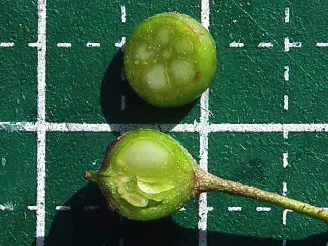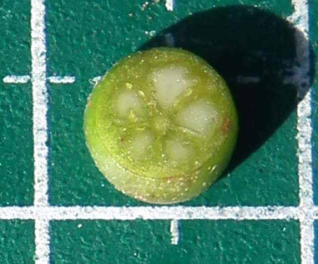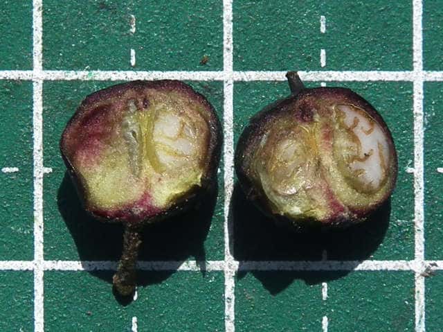 | ▼果実は直径7〜8mm。 | ▼果実の縦断面。 | ▼果実の横断面、種子が2個のもの。 |