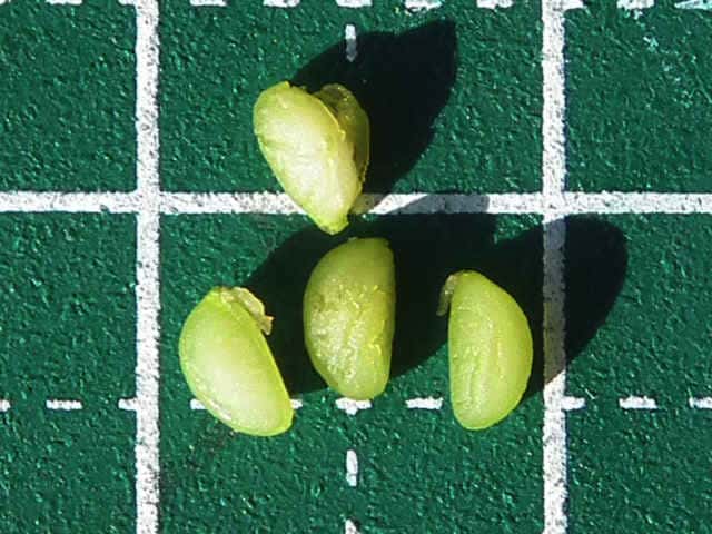 | ▼果実の横断面、種子が5個ある。 | ▼種子が4個あったもの、球を4等分した形。 | ▼種子は長さ約3mm。 |