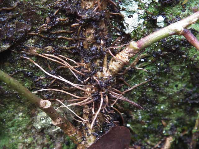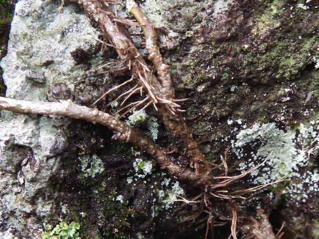 | ▼茎は気根を出して岩や樹木に付着する。 | ||