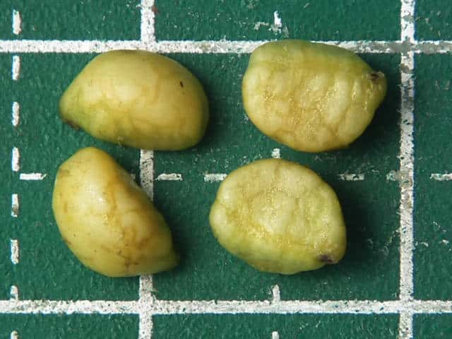 | ▼4個入っていた種子、長さ約6mm、球を分割した形。 | ||