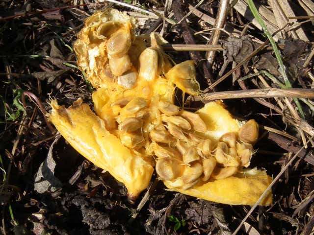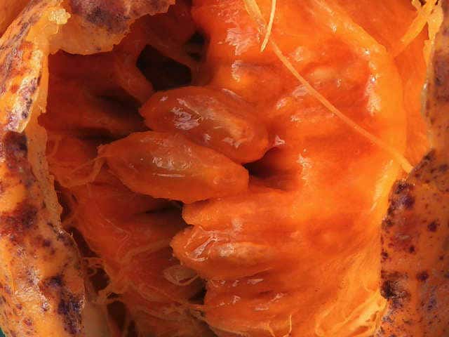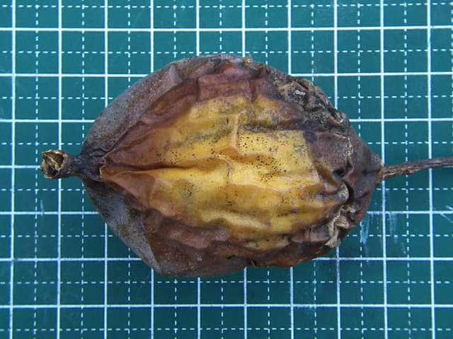 | v果実を割ってみた。 | ▼果肉に包まれた種子が多数入っている。 | |