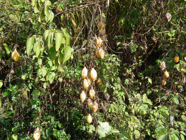 つる性多年草 北海道(奥尻島)〜九州のやぶなどに生える。葉の表面にはやや短毛があり、濃緑色で光沢がある。雌雄異株。花はカラスウリに似ているが、花冠の裂片の先が広い。果実は長さ約10cmで黄色に熟す。種子にはカラスウリのような帯はない。花期は7〜9月。(野に咲く花) 学名は、Trichosanthes kirilowii var. japonica ウリ科カラスウリ属 |