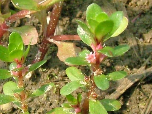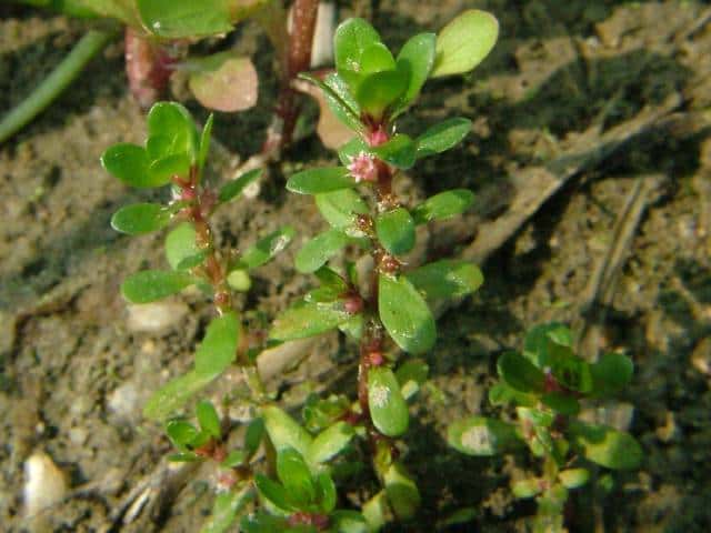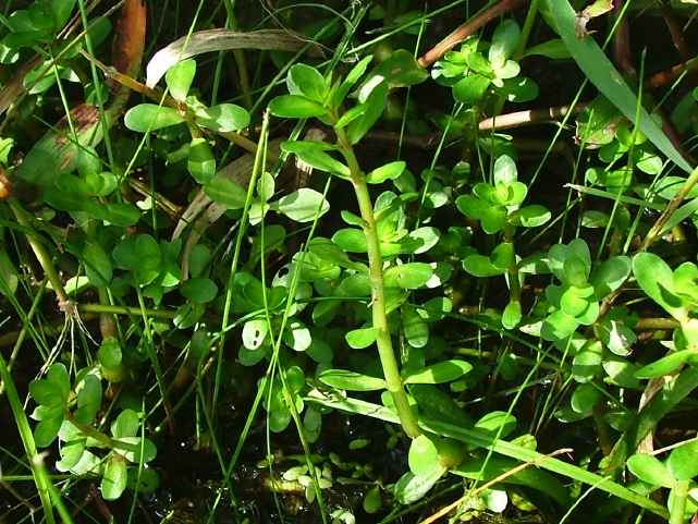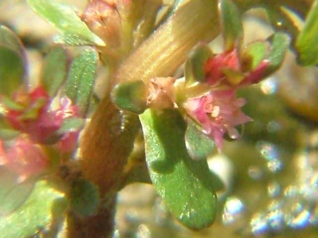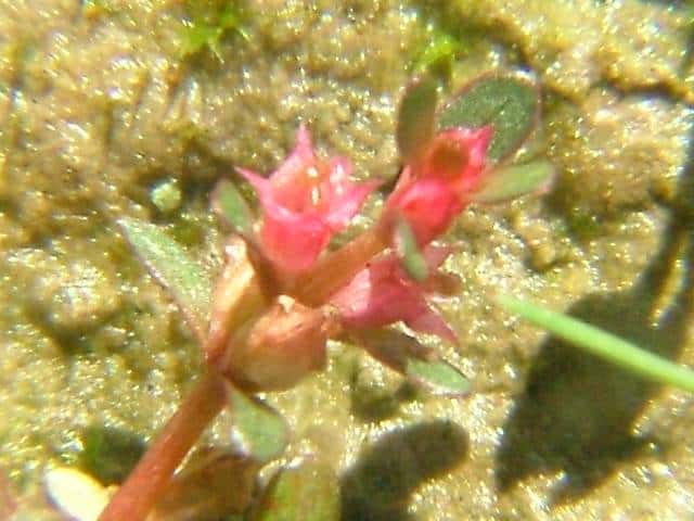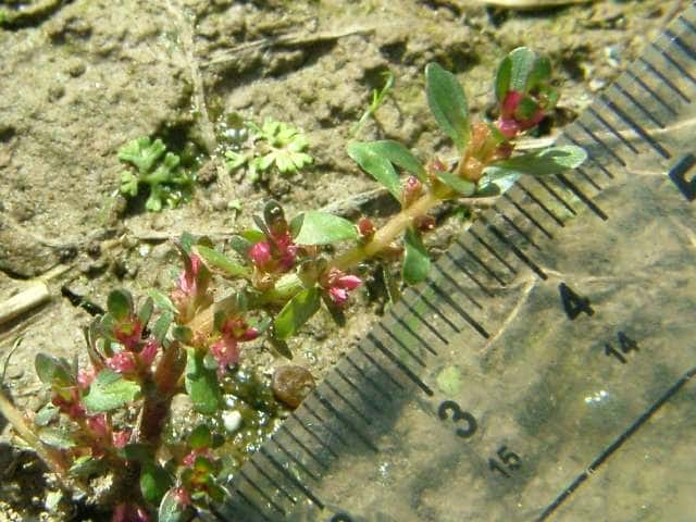 | 多年草 北海道北東部を除く水田や湿地に生える。高さ10〜15cm。全体無毛で茎は赤味を帯びた円柱状で柔らかく地上を這い、茎の先端だけが上を向く。葉は対生で葉柄はほとんどなく、長さ5〜10mmの倒卵状楕円形で厚みがあり先は丸い。花は柄がなく淡紅色で葉腋に1個ずつつき、淡紅色で直径約2mm。萼は筒状鐘形で、先は4裂する。花弁は小さく、萼片と萼片の間につく。雄しべは4個。さく果は、長さ約1.5mmの楕円形で萼に包まれる。種子は長さ約0.8mm、細長い。花期は8〜11月 学名は、Rotala indica var. uliginosa ミソハギ科キカシグサ属 |