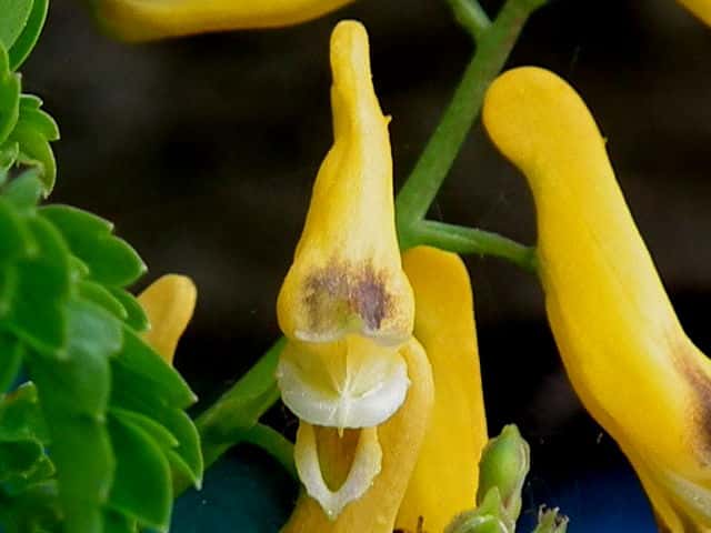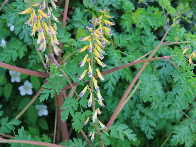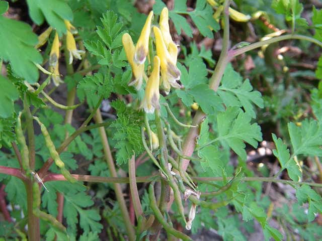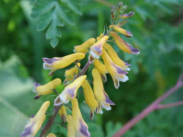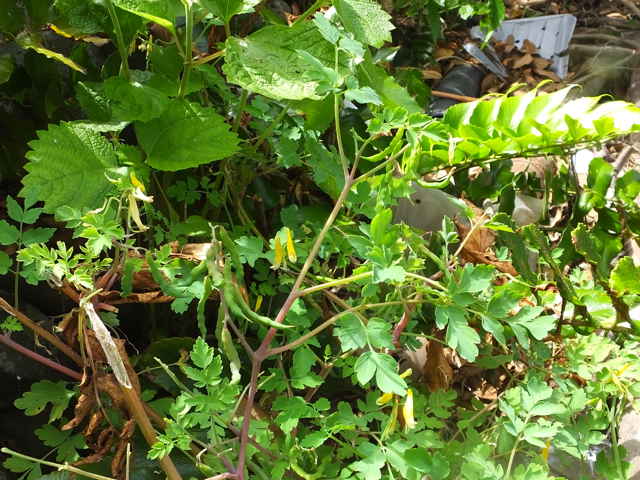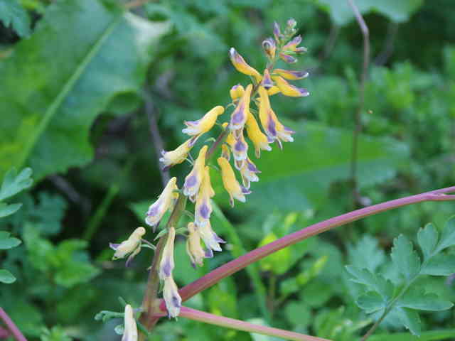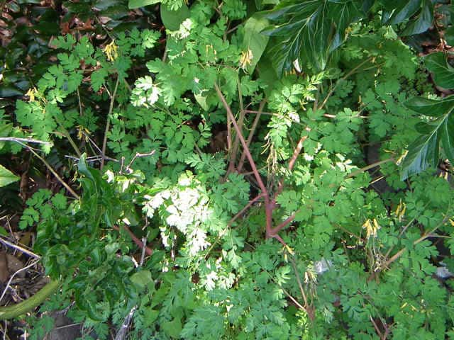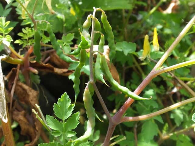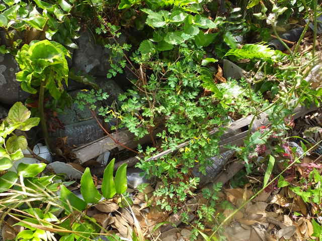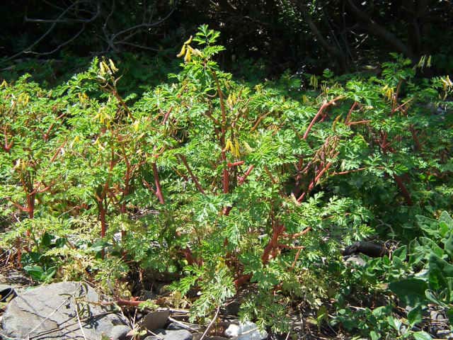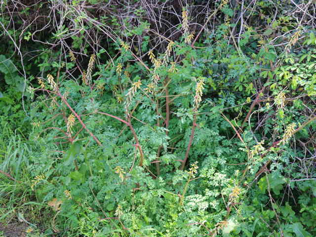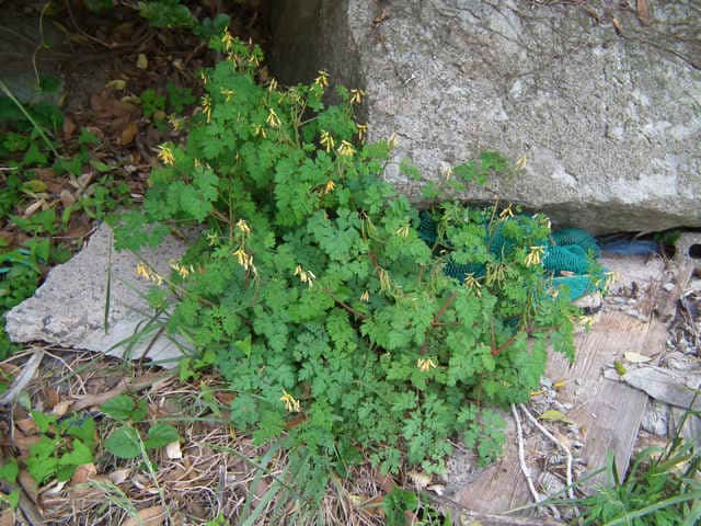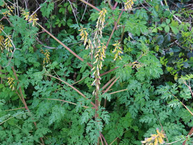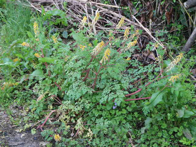 | 越年草 関東地方以西〜沖縄の道ばたに生える。茎はやや肥厚し、高さ40〜60cm、毛はなく全体粉白色を帯びる。葉は2〜3回3出羽状に複生し、長さ幅ともに10〜25cm、終羽片は卵状くさび形で欠刻がある。花は総状花序につき、黄色、長さ15〜20mm。苞は披針形。花柄は4〜6mm。さく果はやや太く、狭長楕円形、ほとんど数珠状にくびれず、長さ約2cm、幅3〜4mm。種子は黒色、直径約1.7mm、表面に微細な円柱状の突起を密布する。花期は4〜5月。(原色日本植物図鑑) 学名は、Corydalis heterocarpa var. japonica ケシ科キケマン属 似た花にフウロケマンやミヤマキケマン、ツクシキケマンがある。 ・キケマン : 種子が2列に並び、果実がほとんど数珠状にならない。 ・ミヤマキケマン: 種子が1列に並び、果実がいちじるしく数珠状にくびれる。 ・フウロケマン : 果実が長さ10〜20mm、少し数珠状にくびれる。 ・ツクシキケマン: 種子が1列に並び、果実が数珠状にくびれる。 |