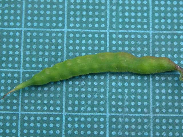 | ▼数珠状にくびれず、中には種子が2列に入る。果実は長さ約3.5cm。 | ||