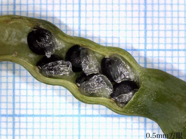 | ▼果実には種子が2列に並んでいる。 | ▼種子には膜状の種枕がついている。 | |