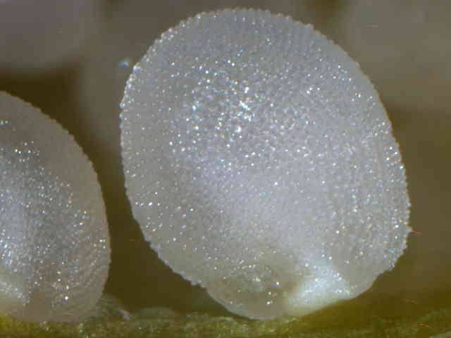 | ▼表面に微細な円柱状の突起が密生する。 | ▼若い種子は直径約1mm。 | ▼大きなものの葉は長さ約25cm。 |