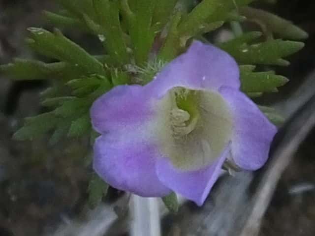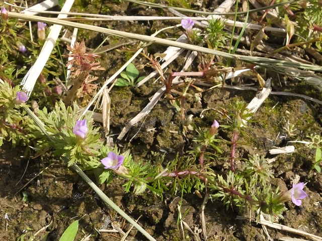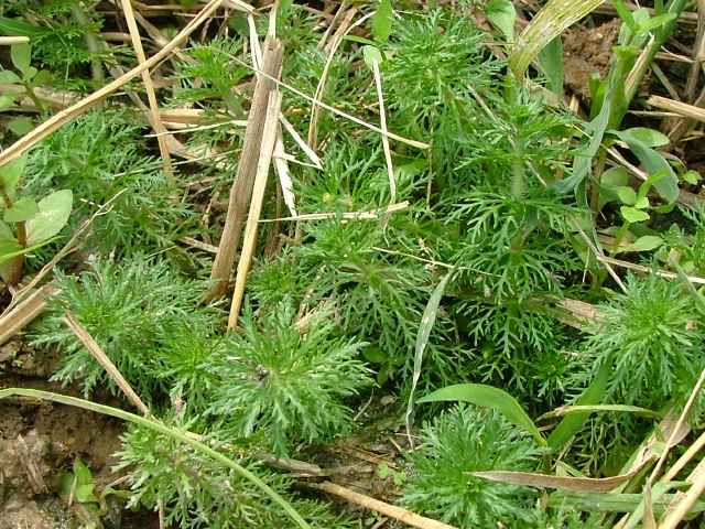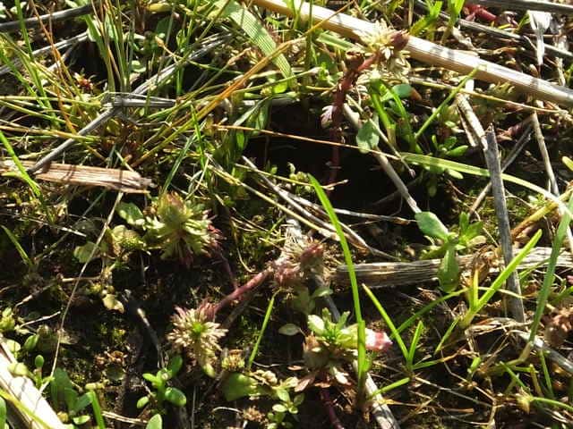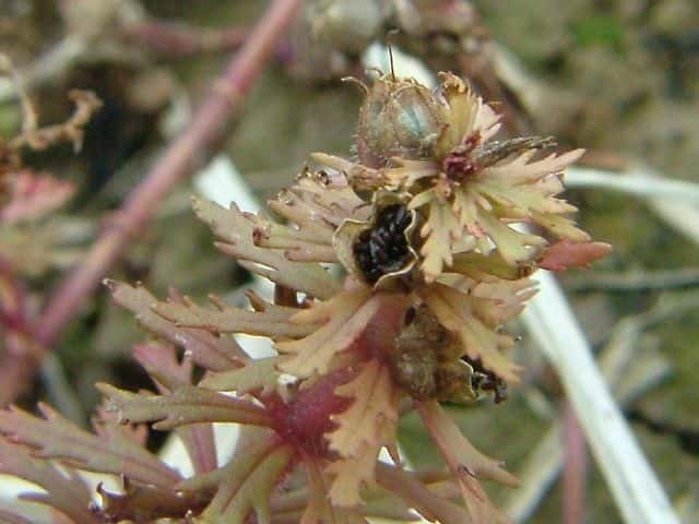 | 多年草 本州〜沖縄の水田や浅い沼、池などの水中に生える。地下茎は泥の中をはう。水上葉は5〜8個輪生し、長さ1〜2cm、幅3〜7mmで羽状に深く裂ける。水中の葉は糸状に裂ける。水上葉の葉腋に紅紫色の小さな唇形花をつける。花冠は長さ0.6〜1cmの筒状で、上部は浅く裂けて唇形になる。上唇は幅が広く、先端が少しへこむ。下唇は深く3裂し、裂片の先はとがる。花冠の内側には白い毛が生えている。萼は5深裂し、軟毛がある。さく果は長さ約4mmの卵球形。しばしば水中葉の葉腋に閉鎖花がつく。花期は8〜10月。(野に咲く花) 学名は、Limnophila sessiliflora オオバコ科シソクサ属 同属のコキクモは萼や茎に毛が生えない点で区別できる。 |