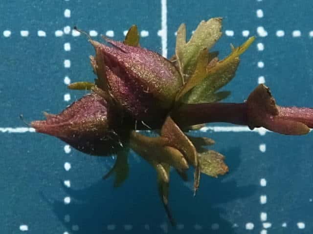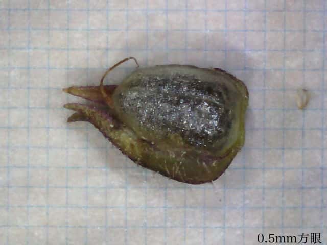 | ▼果実を包む萼は長さ約5mm。 | ▼萼を半分除くと、中に果実がある。 | |
