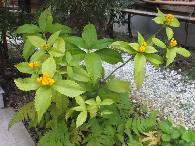 | 常緑小低木 センリョウの果実の黄色くなる品種。葉は対生。葉身は長さ10〜15cm、幅4〜6cmの長楕円形〜卵状楕円形。先はとがり、ふちには鋭い鋸歯がある。花は両性。枝先に小さな花が集まってつく。花には花弁も萼もなく、子房の横に雄しべが1個つく。果実は核果。直径5〜7mmの球形で、12〜3月に朱赤色に熟す。核は直径3〜4mm。花期は6〜7月。 学名は、Sarcandra glabra f. flava センリョウ科センリョウ属 [センリョウ] 東海地方、紀伊半島〜沖縄の暖地の林内に生える。高さ50〜100cmになる。葉は対生。葉身は長さ10〜15cm、幅4〜6cmの長楕円形〜卵状楕円形。先はとがり、ふちには鋭い鋸歯がある。花は両性。枝先に小さな花が集まってつく。花には花弁も萼もなく、子房の横に雄しべが1個つく。果実は核果。直径5〜7mmの球形で、12〜3月に朱赤色に熟す。核は直径3〜4mm。花期は6〜7月。(樹に咲く花) |